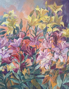 This vibrant artwork is a stunning still life that captures the essence of floral abundance. A robust bouquet of flowers, dominated by rich reds, deep purples, and soft pinks, bursts...