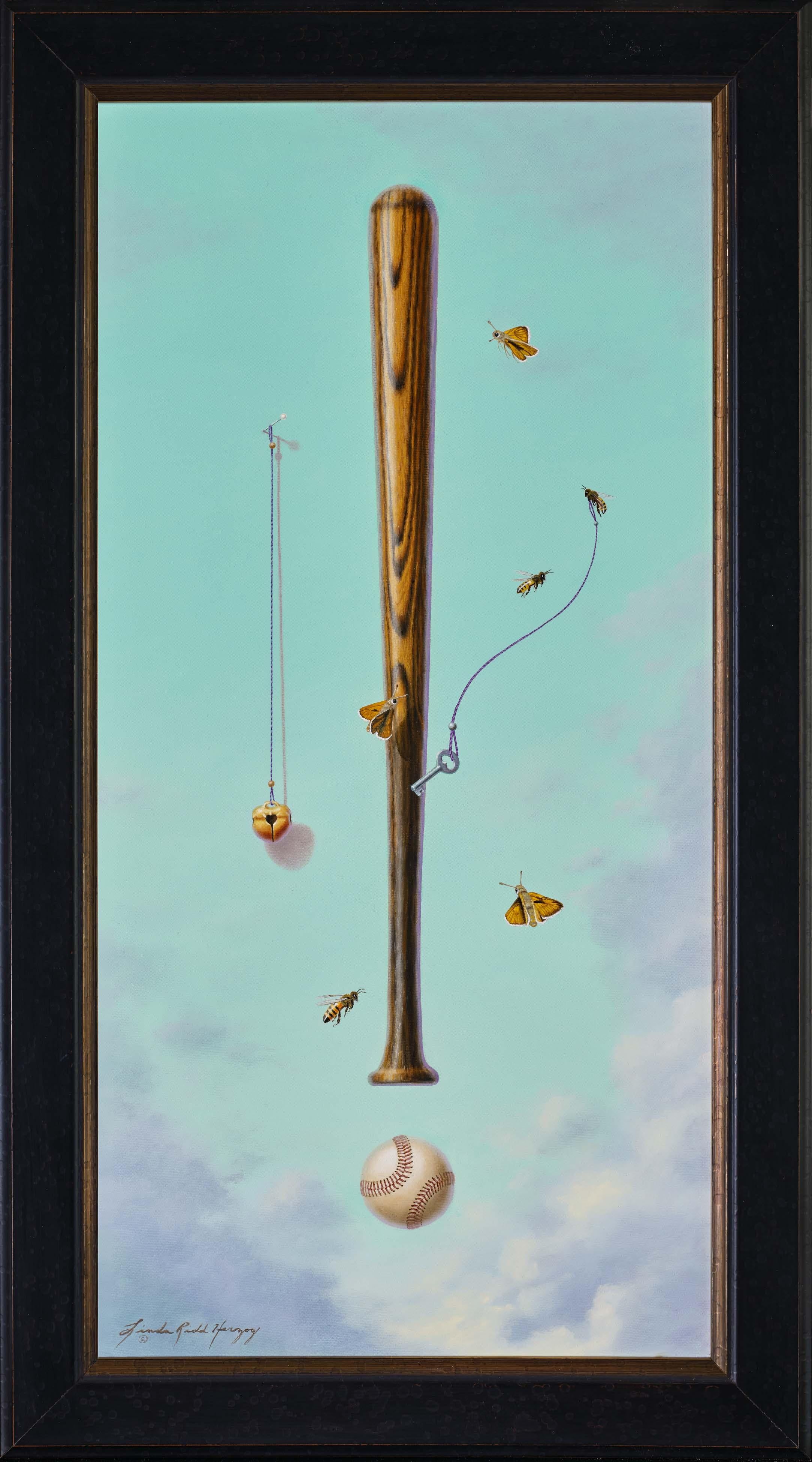 A still life of a Ushanka, a Russian winter hat, fur trimmed with ear flaps. Personett's textured fur and wood table invites the viewers to feel as if they are in the painting. The frayed edges of the strings of the hat suggests this is a well-worn garment, loved for many years. Groupings of snowberries rest beside the hat, a delicate symbol of purity and resilience.