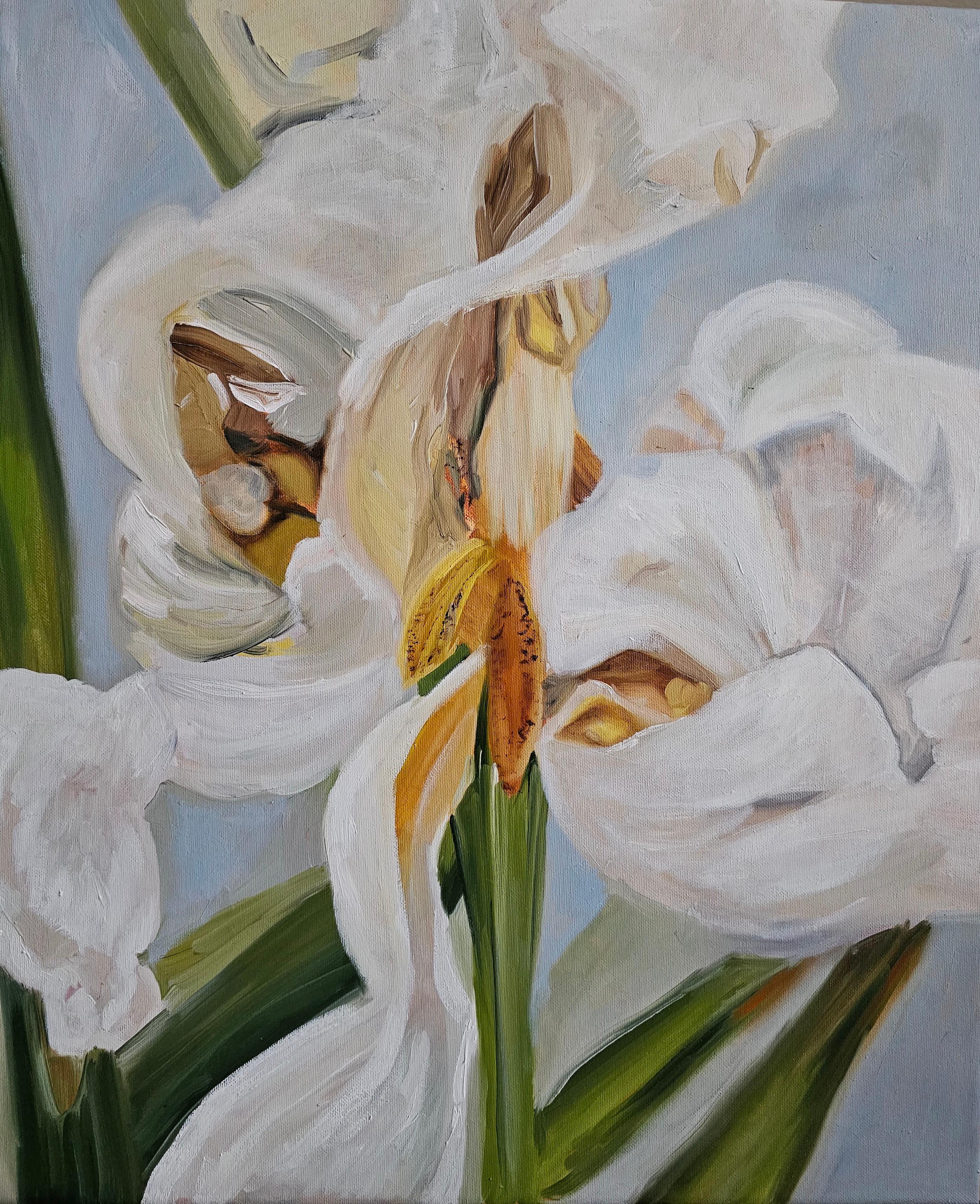 The composition is built through energetic strokes and visible impasto, particularly in the flowers and vegetation, where layers of color create texture and visual rhythm. The garments of the figures are treated with softer transitions, balancing the dynamic surface with a sense of calm intimacy.