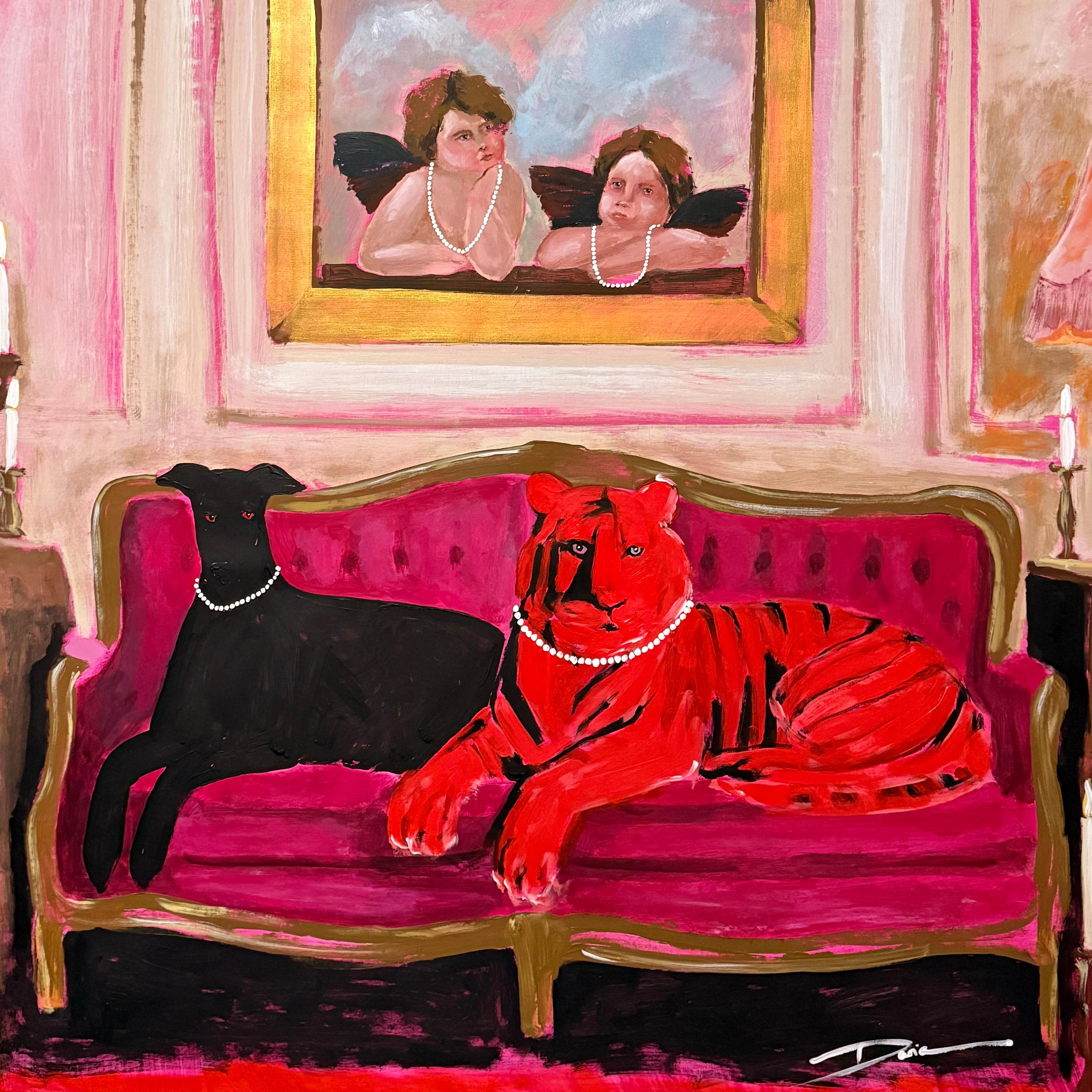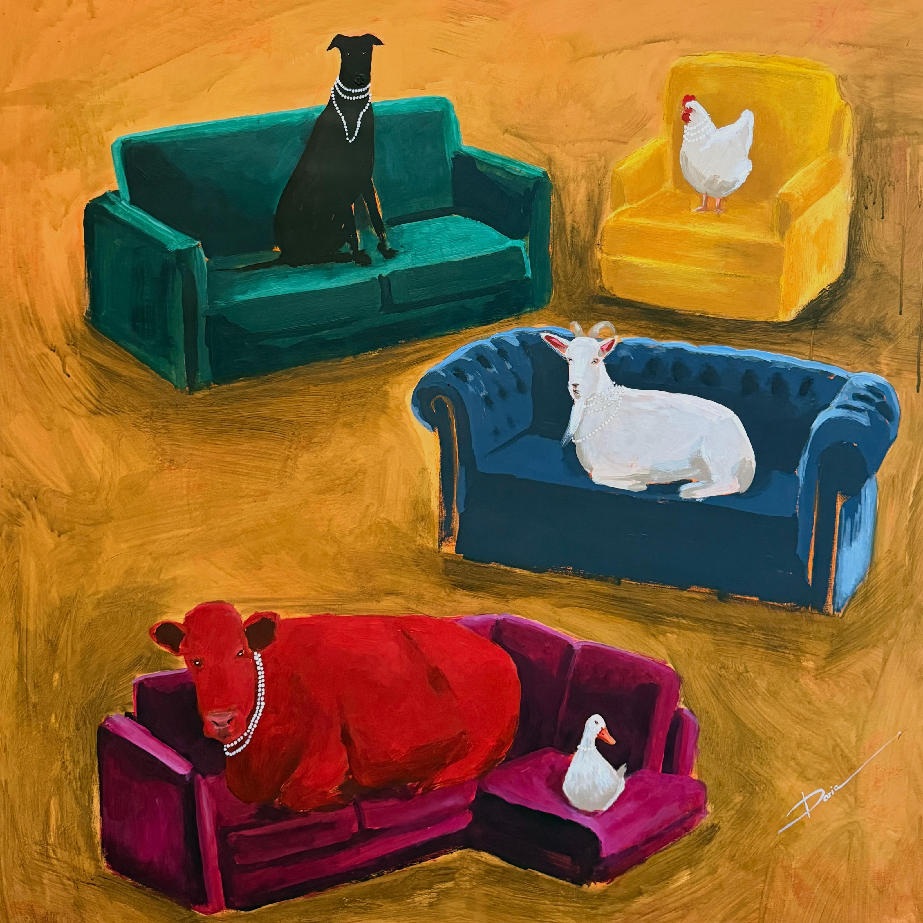 Thomas Broadbent"Home on the Range" contemporary surrealist oil painting, bison, birds, chaise, 2024