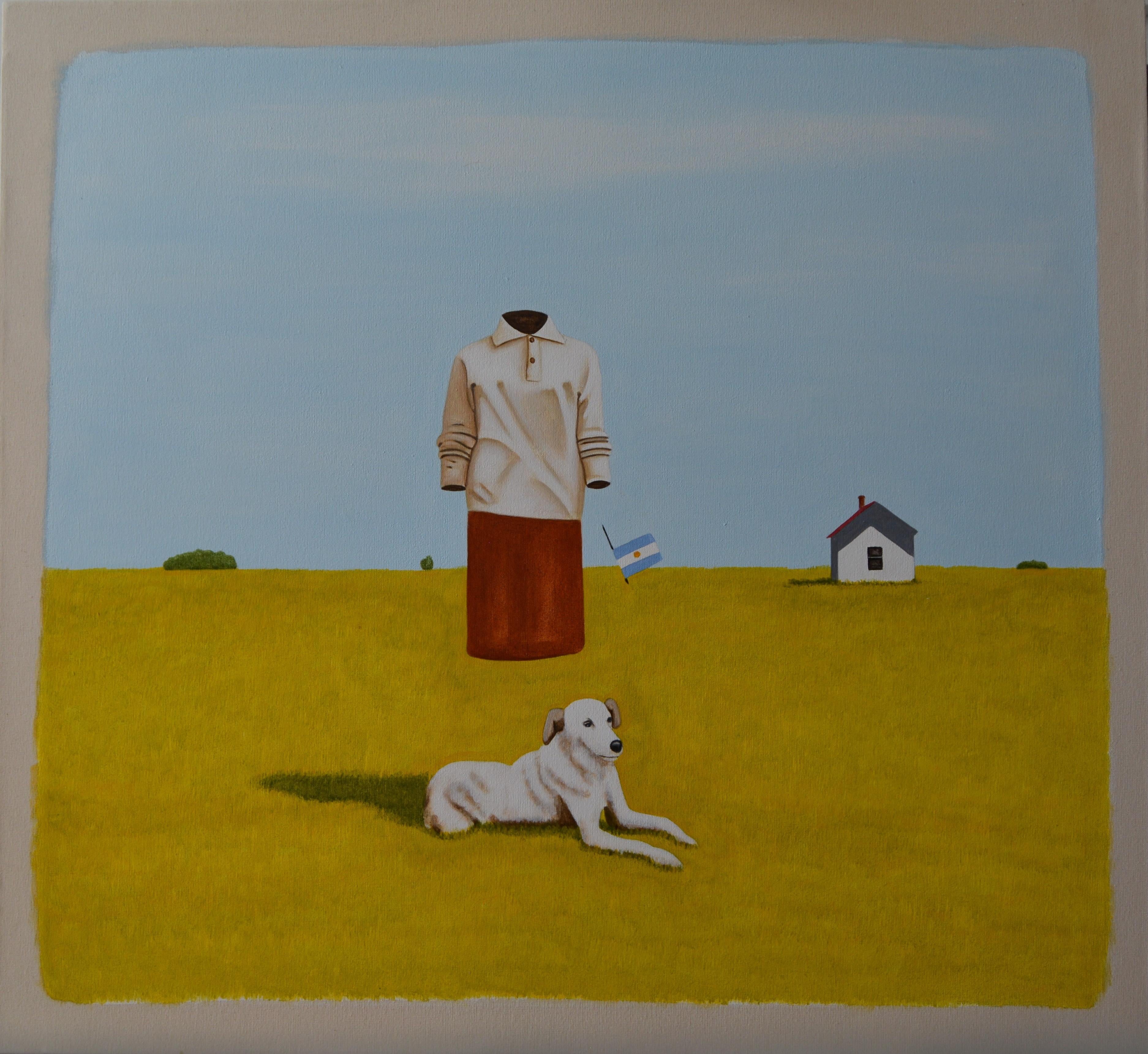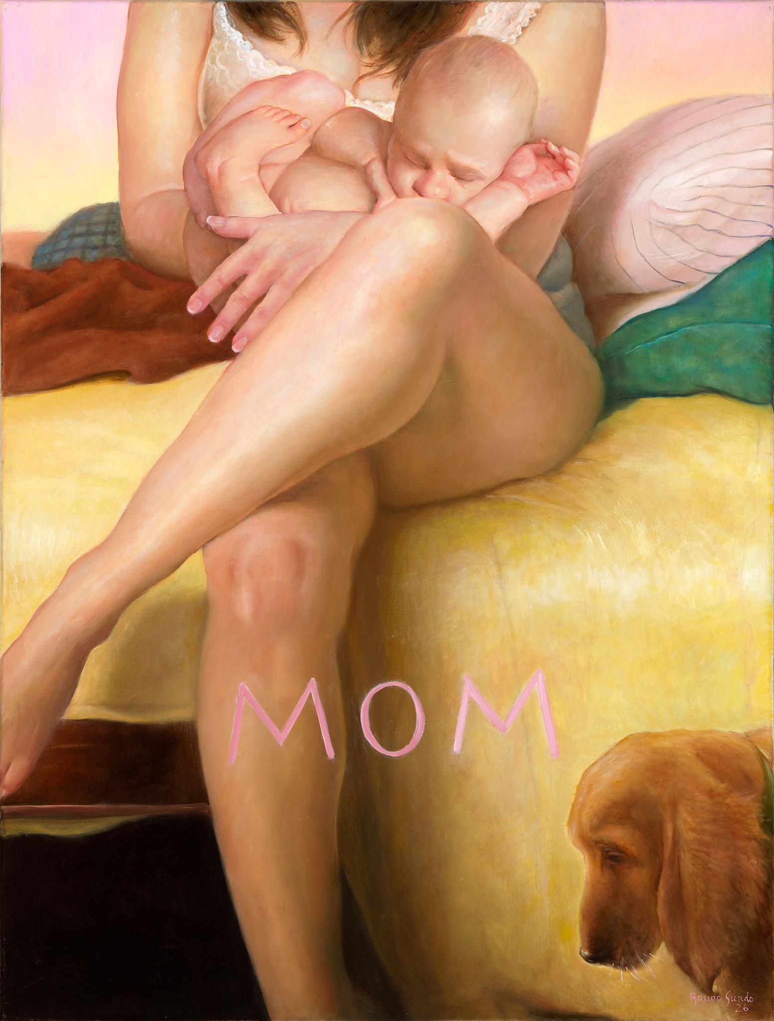 An charming 19th century dog painting depicting a mother dogue and her exuberant topsy turvy pups by the farmhouse barns or cowsheds , with a young child given them a fuss!