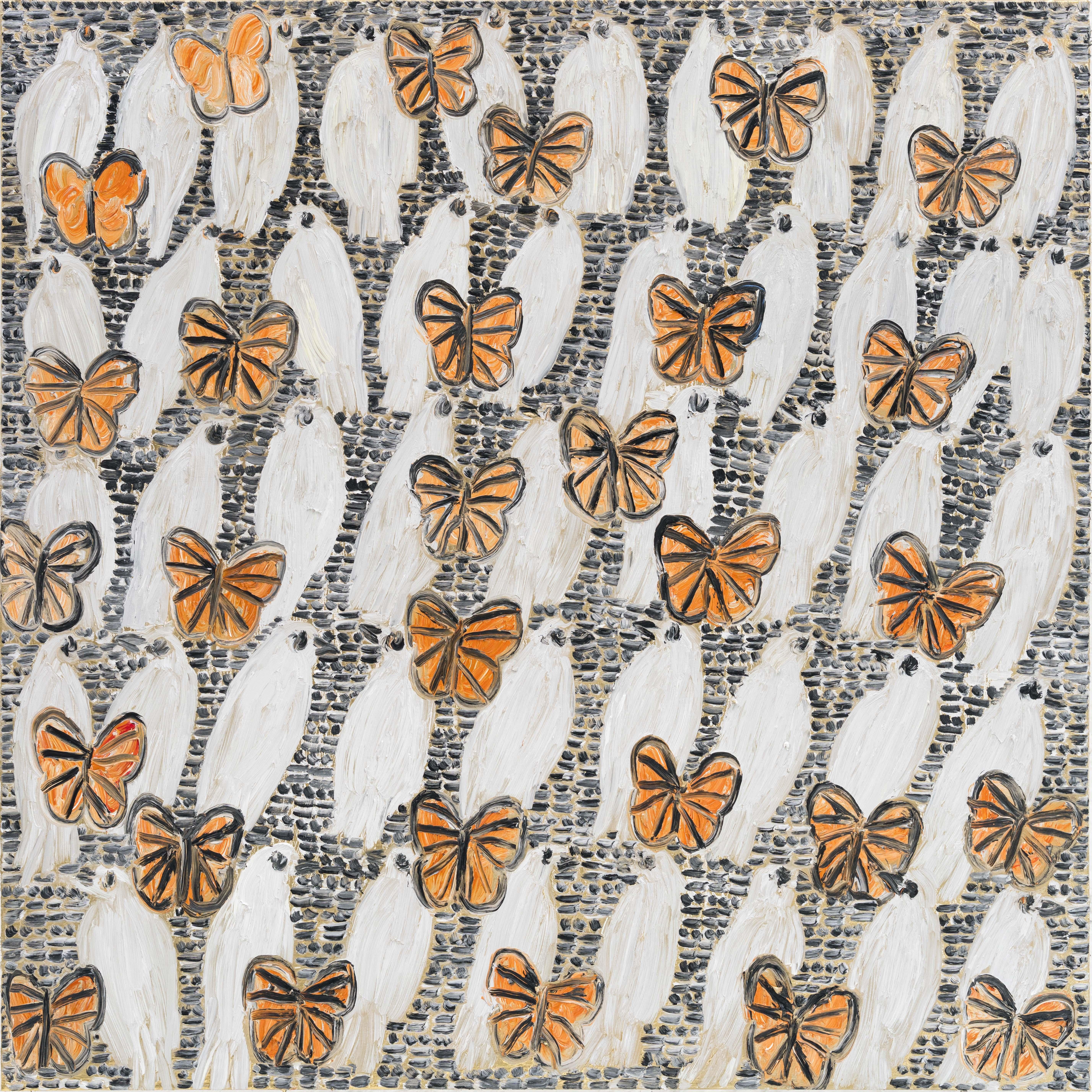 Vibrant butterflies gather around and fly amongst dandelion fluffs floating in the air. Part of artist Natasha Tayles' whimsical series on butterflies. In col...