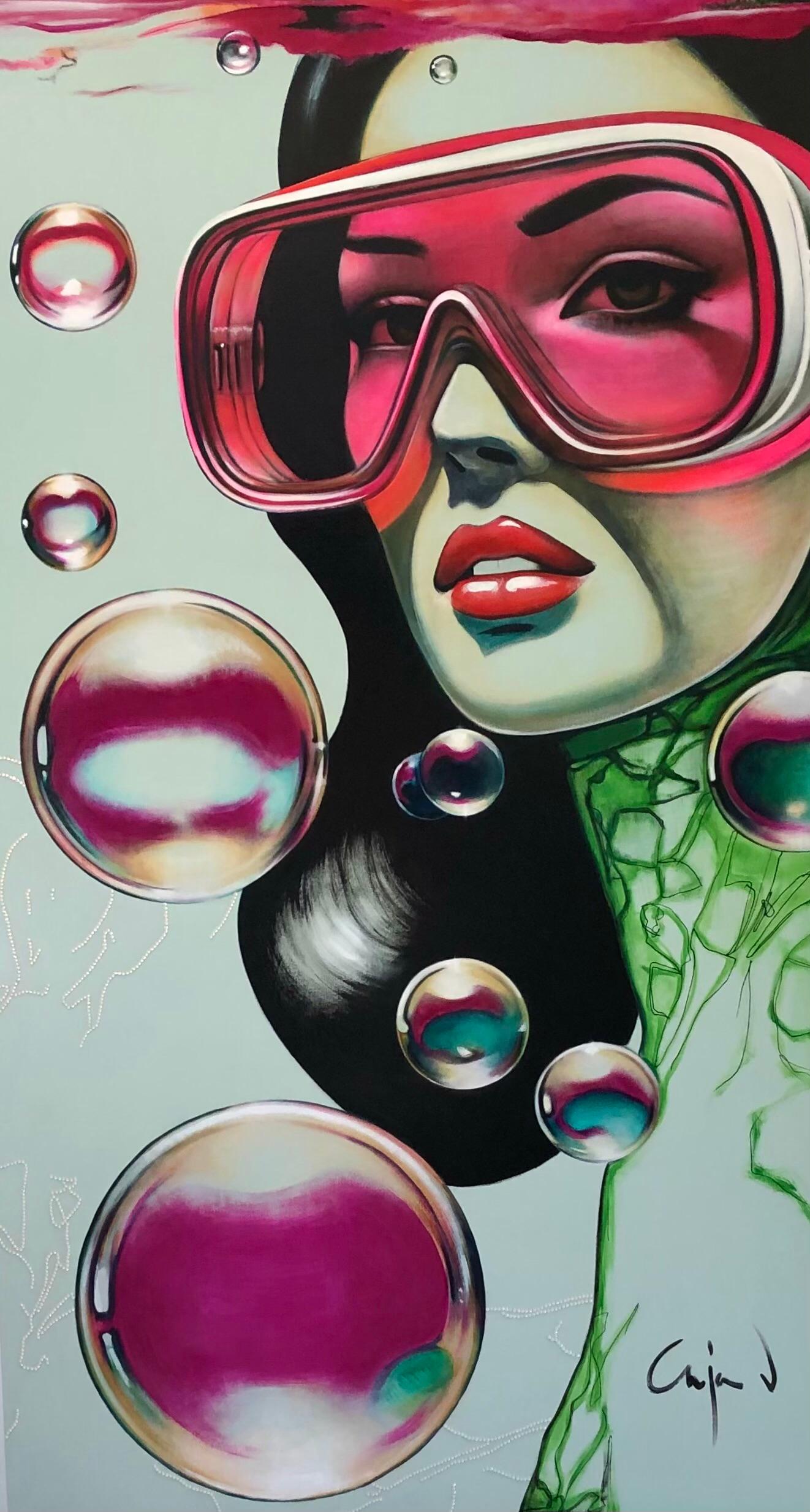 Artist Guigen Zha presents a stylized portrait of a woman’s head, adorned with floral and tree-like elements against a backdrop of blue sky, moon, and seascap...