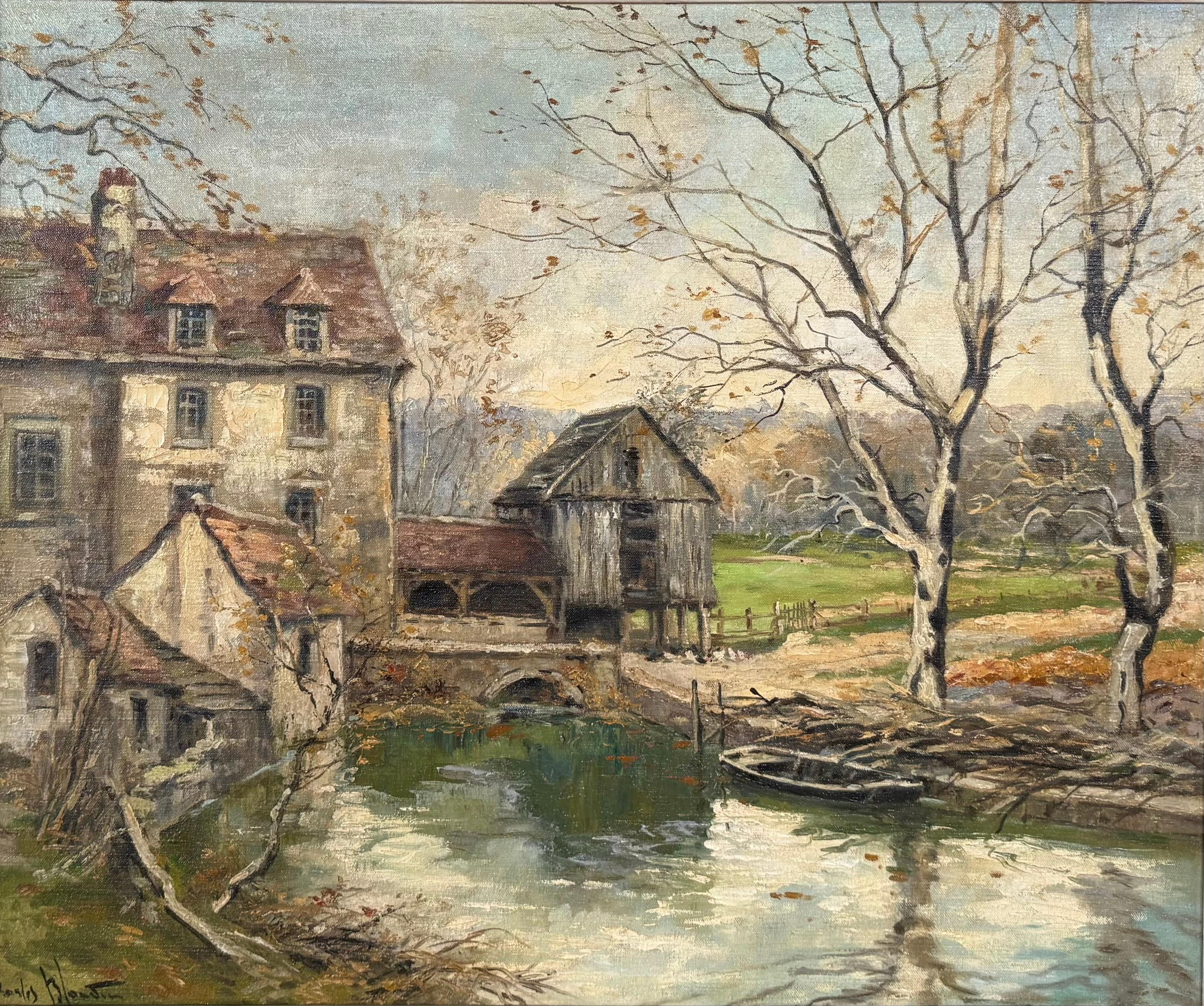 Tranquil French River Landscape with Trees Reflections Impressionist Painting French School, mid 20th century signed lower right oil on board, unframed Board: 10.75 x 14 inches Prove...