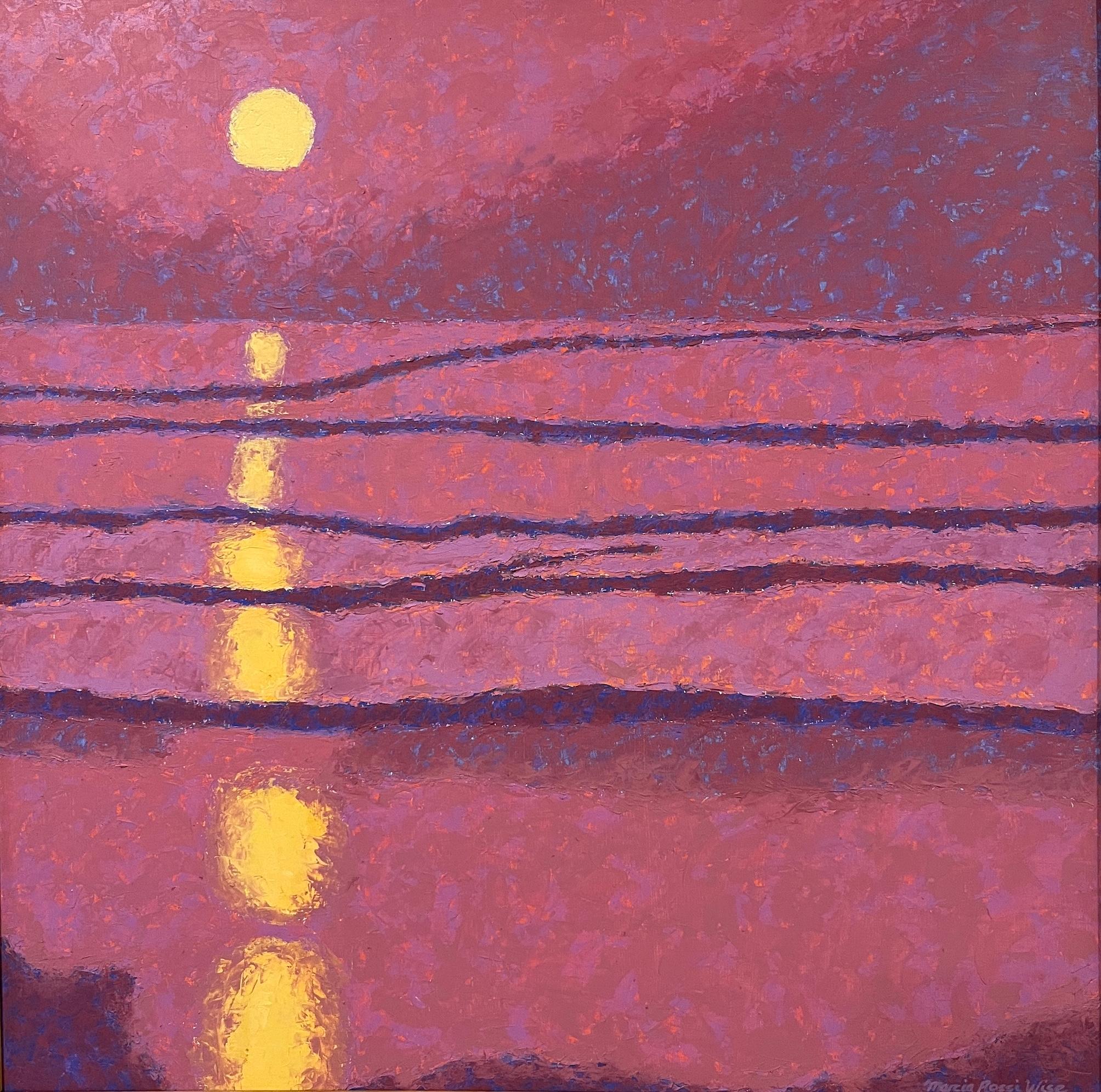 This painting captures a serene rural moment through bold color and expressive texture. A vibrant pink house becomes the focal point of the composition, creating a striking contrast ...