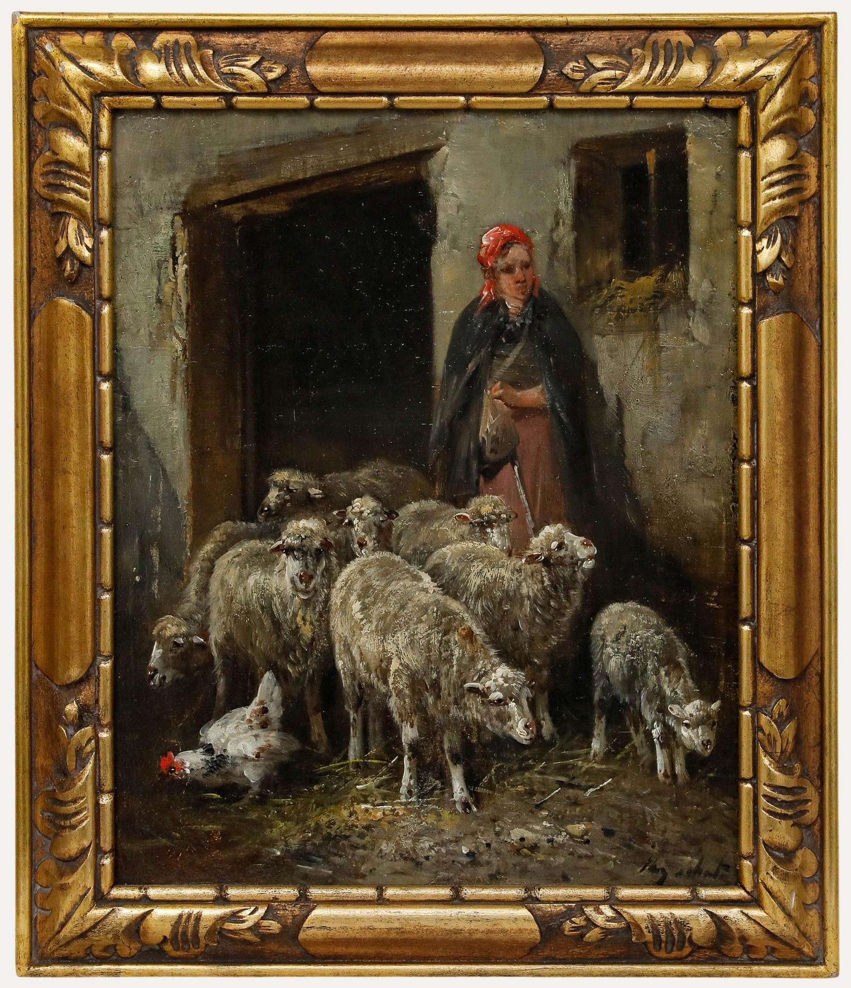A fantastic rural farmyard scene featuring horses, pigs, goats, chickens, ducks and cattle by John Frederick Herring Jnr. In the foreground, pigs, goats and chickens are shown foraging for food whilst horses watch on. To the right, a bay horse drinks from a pond next to some ducks as cattle graze outside a barn. In the distance two figures can be seen walking along a country path towards a church.