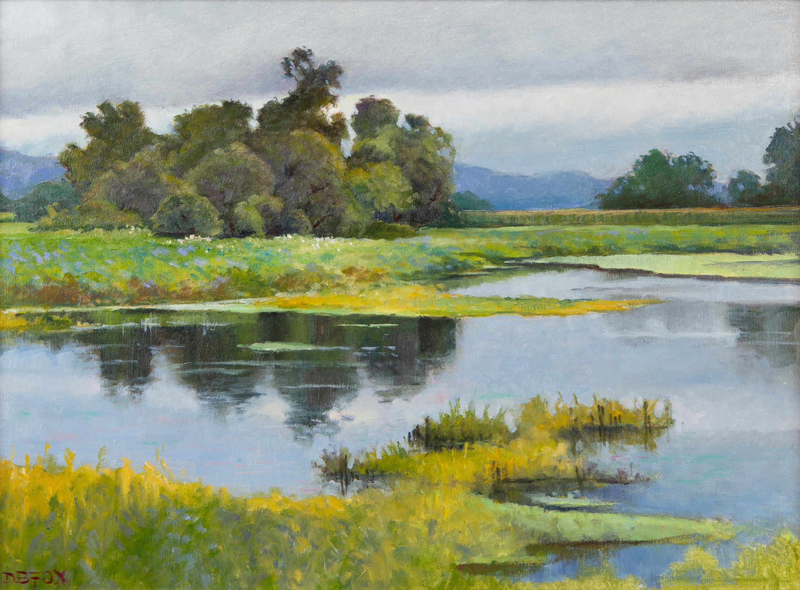 Judd Mercer's (US based) "Castle Grounds," is an original, handmade oil painting that depicts the green shore of land that casts a reflection of its emerald hued trees and foliage into the water.