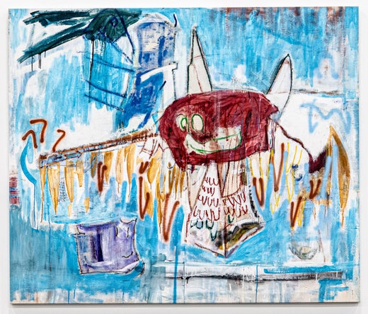 This large scale 76" x 90" mixed media canvas painting by XVALA features a Basquiat-style large red creature predominantly placed on the canvas against a light blue background. Other colors include varying blues, golds and black. Acrylic paint, spray paint and oil stick were used on a linen canvas.