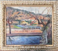 This mid-century oil on canvas by Catalan painter Simó Busom i Grau presents a vibrant Mediterranean landscape with river and house, painted in an expressive postwar Spanish style associated with the Barcelona school. Artist: Simó Busom i Grau (Barcelona, 1927–2020) Title: Mediterranean Landscape with River and House Date: Mid-20th Century (circa 1950s–1960s) Medium: Oil on canvas Canvas size: 46 x 55 cm (18.1 x 21.6 in) Framed size: 59 x 68 cm (23.2 x 26.8 in) Signature: Signed lower right Condition: Good overall condition. Stable paint layer. Frame: Decorative frame included, ready to hang Location: Sitges, Spain Style: Spanish Postwar Landscape / Mediterranean Modern A refined example of postwar Catalan landscape painting, this original oil by Simó Busom i Grau captures the Mediterranean atmosphere through confident brushwork and luminous color transitions. The composition centers around a warm yellow house set against rolling terrain and flowing water. Gestural trees structure the foreground, creating depth and movement while framing the landscape. The artist’s handling of paint is energetic yet controlled, with visible impasto and layered color planes that enhance texture and spatial presence. The palette moves between cool river blues and sunlit earth tones, reflecting the light and tonal vibration characteristic of mid-20th century Spanish painting. The result is a work that balances decorative appeal with painterly authenticity. Compact in size yet visually dynamic, it functions beautifully in residential interiors or curated collections of European mid-century art. The painting is signed and offered with decorative frame, ready to hang. Simó Busom i Grau (Barcelona, 1927–2020) was a Catalan painter trained at the Acadèmia Baixas in Barcelona. He developed a career closely linked to the city’s artistic circuit, exhibiting regularly in Barcelona and Madrid and maintaining connections with the historic Sala Parés. His work focused primarily on Mediterranean and urban landscapes, characterized by expressive brushwork, structural clarity and a luminous color palette rooted in modern Catalan tradition. Catalan landscape painting Spanish mid century oil Mediterranean river landscape Barcelona school painting Simó Busom signed oil Postwar Spanish art European mid century painting...