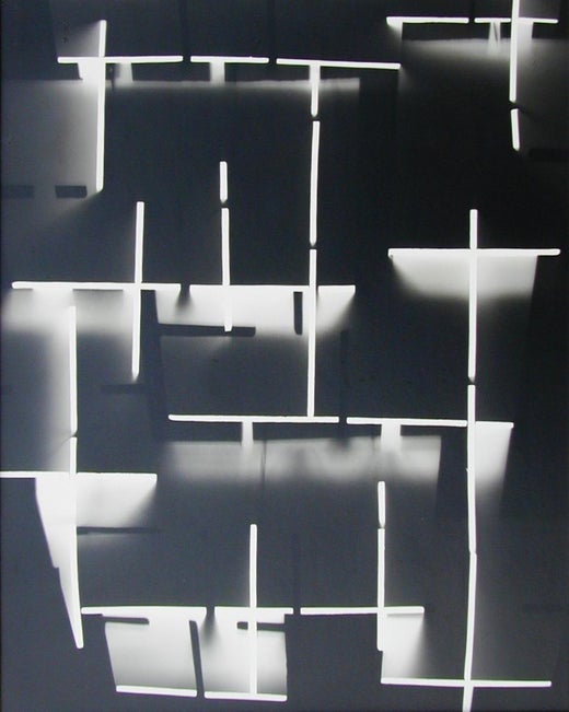 Blue Print by Ida Lansky is an abstract black and white photograph, composing of white lines and geometric shapes against a black background.