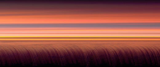 For SELJALANDSFOSS #3, Johnson carried his camera equipment into a giant cavern behind a monolithic, 200 foot high cascade. Turning to look back outward, he captured an ephemeral curtain—a delicate and translucent waterwall—through which one magically views a wide horizontal stretch of the distant azure sky.