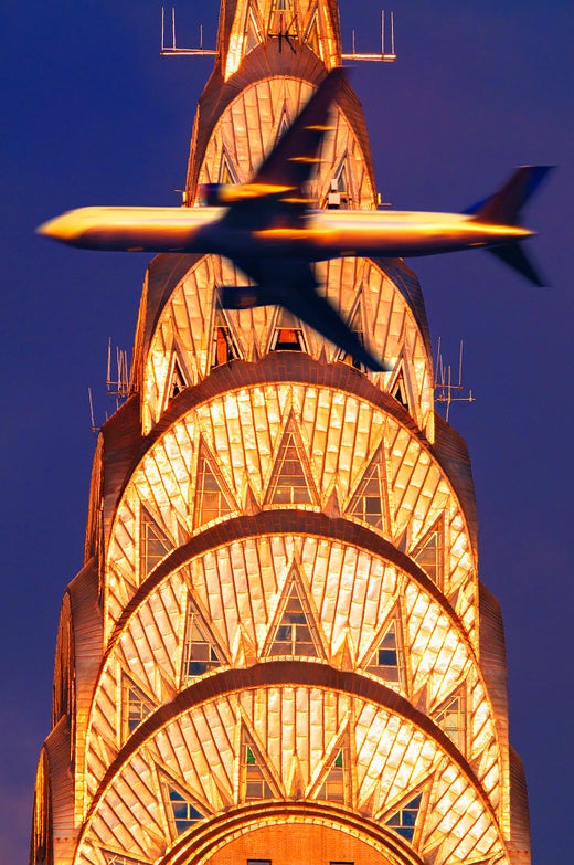 C-print of an abstracted Rockefeller Center at night in New York City by contemporary photographer Susan Wides, in yellow, black and green.