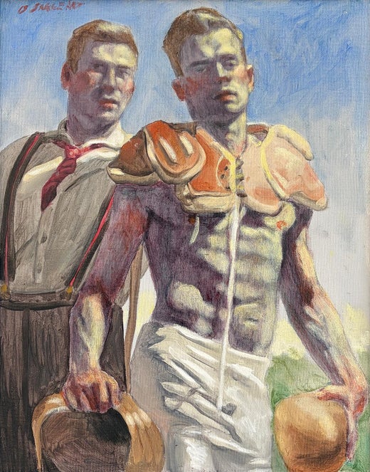 Beard's most prominent artistic alter ego is Bruce Sargeant, whom the artist has positioned in exhibitions as an early 20th-century painter. Beard's work as Sargeant is a detailed study of the male physique. The paintings often feature sculpted athletic men engaged in physical activities like wrestling and rowing. The work is steeped in homoeroticism, and the artist’s name itself is a reference to painter John Singer Sargent — while he’s best known for his Edwardian-era portraits, John Singer Sargent also created murals and drawings of male nudes that were similarly reflective of a homoerotic sensibility.