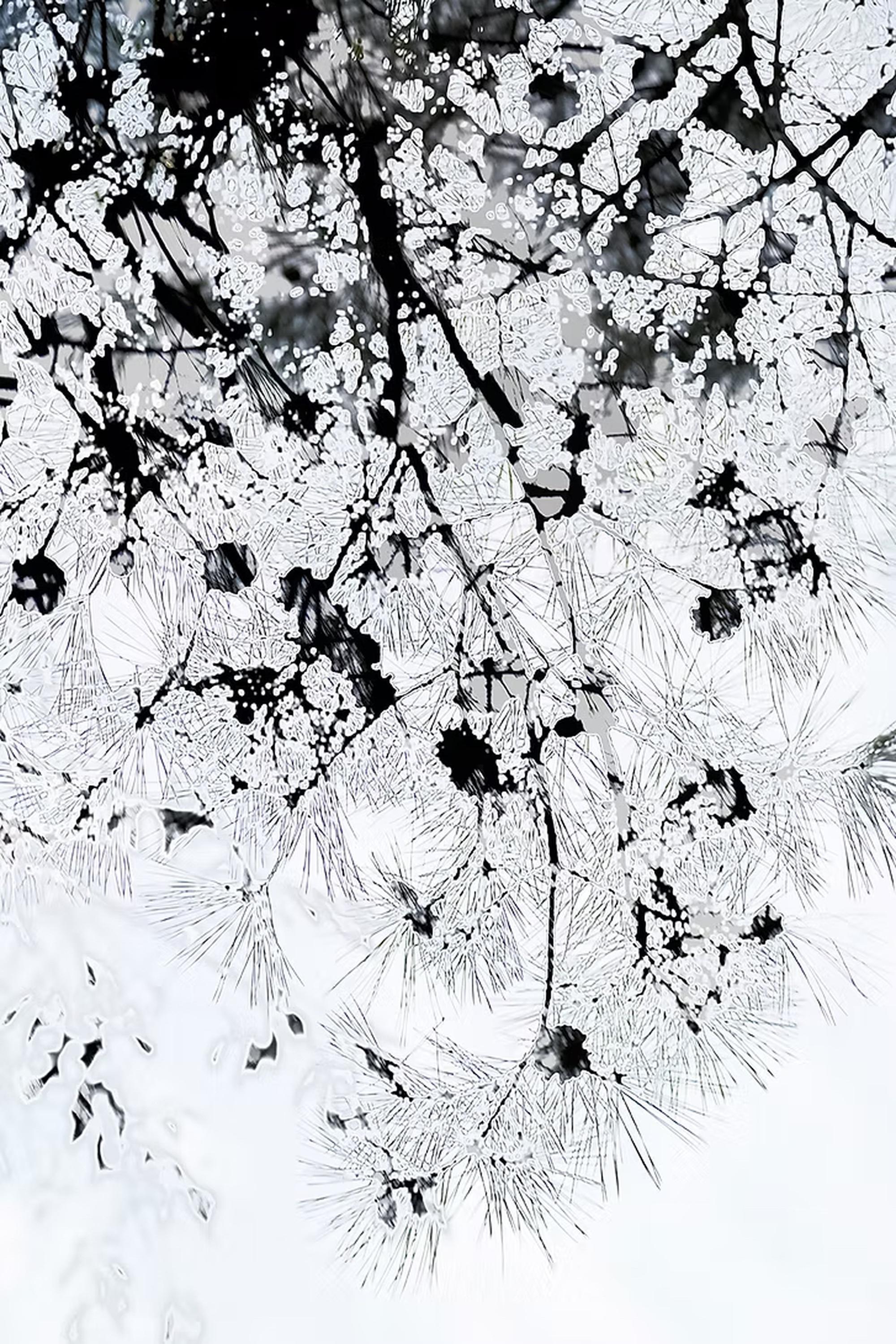 Gerald Berghammer - Black and white photography. Waterfall in a forest, with water cascading down rocks and surrounding trees, and a fallen log. Archival pigment ink print as part o...