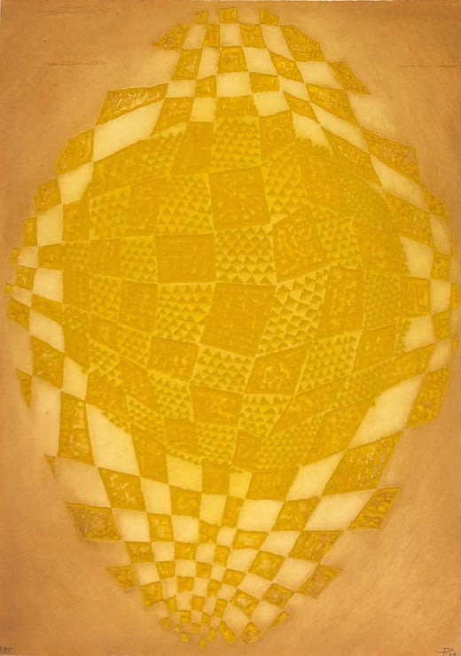 Piza was born in Sao Paulo in 1928, where he received his first training. He moved to Paris in 1955 and worked in the studio of the master of colour etching, Johnny Friedlaender. Piza soon became expert in all the techniques of etching and aquatint, using sugar-lift extensively, but he experimented in various ways to make his work more sculptural and three dimensional. He abandoned traditional etching techniques and, using very thick copper plates, he devised his unique "gouge" technique by incising his designs into his plates with hammers and various shaped chisels. The precision required is exact as his grooves need to be precisely deep and wide enough to hold his hand-made special inks. Because of the depths of the grooves, the direction of the wiping directly affects the final impression. Each impression of his prints requires at least 30 minutes between colours in order for the plate to be re-inked and wiped, and he has to use cold plates in order for the inks not to dry out. The process of producing each impression is a time consuming and laborious process of collaboration between Piza and his printers. His work has met with great success and is shown in major public collections world-wide, including MOMA in New York, the Bibliothèque Nationale and the Musée d'Art Nationale (Centre Pompidou) in Paris. He has been awarded numerous prizes, notably for etching, at the 1959 Sao Paolo Biennale and at Documenta Kassel in 1959. Public Collections: Solomon Guggenhiem Museum,