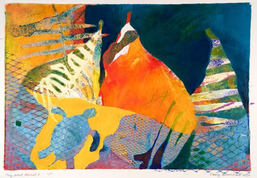 Primarily a self- taught artist, Casey explores her experiences through the engaging and often unpredictable print medium of monoprinting. She is most interested in the spiritual aspects that emerge in the image, particularly relating to how we live in the world and how the world lives in us. In the beginning the work may be a search for answers, but in the end it’s more about being here without them. Creating a monotype or monoprint is a process using moistened paper with oil paint and/or etching inks. Working with a press and printing plate, an additive or subtractive method is often used with multiple layers of images to create an individual work. Casey often works on a theme which becomes a 10 to 15-piece collection. Each work is on archival 100% rag paper and is one of a kind. Her artwork is found in the permanent collections of UVM Medical Center, Dartmouth Hitchcock Medical Center, and Boston Children’s Hospital. Her artwork is also in many hotels nationwide, private collections, web designs, and various published materials. Casey Blanchard was born in Greenwich, CT in 1953. She lives in Shelburne, VT with her husband, Dan Cox.