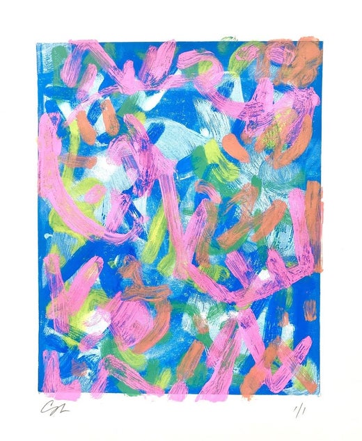"I produce these monotypes layer by layer and often color by color. Each one is made with four or five separate layers of ink, starting with a solid color as the bottom layer and working up from that. My style of work is very loose and gestural, which is often not what one thinks of when talking about printmaking. However working in this monotype printing format allows me to carry my creative hand over from painting on canvas to working on paper. More interestingly to me is that this method results in each monotype becoming an individually unique piece that can never be reproduced, which I find really special." – Casey Haugh