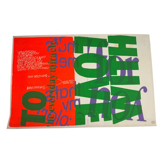 Popularly known as "Sister Mary Corita," the artist turned to the silkscreen process in 1950. Her large compositions combine quotations, often from the Bible or modern poetry, with religious or secular images. She achieved fame in the early 1960s with her brightly colored silkscreen posters. Some of her work includes excerpts from the writings of Carl Jung, e.e. cummings and Rainer Maria Rilke. She began adding words to her designs because, she said, "I have been nuts about words and their shape since I was very young."