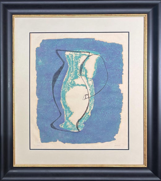 Lithograph, stencil on vélin paper. Paper Size: 12.4 x 9.65 inches. Inscription: Signed in the plate and unnumbered, as issued. Notes: From the album, XXe siècle, Nouvelle série N° 9 (double) Juin 1957, Cahiers d'Art publiés sous la direction de Gualtieri di San Lazzaro, 1957. Published by Société Internationale d'Art XXe siècle, Paris, under the direction of Gualtieri di San Lazzaro, éditeur, Paris; printed by Atelier Jacomet, Paris, under the direction of Daniel Jacomet, Paris, 1957. Additional notes: Excerpted from the academic article, “Promoting Original Prints, The Role of Gualtieri di San Lazzaro and XXe Siècle” by Valerie Holman, published in Print Quarterly, XXXIII, 2016, 2, Until recently very little has been written on the Italian author and art publisher Gualtieri di San Lazzaro (1904-75), yet for 50 years he chronicled the life and work of contemporary artists, produced monographs of exceptional quality, and disseminated original prints by modern painters and sculptors through his best-known periodical, XXe Siècle. Although still a relatively unfamiliar figure in the United Kingdom, San Lazzaro is one of the half-dozen great art publishers of the mid-twentieth century who, together with his exemplar, Ambroise Vollard (1866-1939), and those of his own generation, Christian Zervos (1889-1970), Tériade (1889-1983) and Albert Skira (1904-73), chose to base himself in Paris, seeing it throughout his life as the centre of the art world….XXe Siècle, an illustrated periodical, was launched in 1938 and printed in editions of approximately 2,000, each issue containing both photographs and four-colour separation reproductions across a wide spectrum of visual imagery ranging from masterpieces of Western painting to popular prints from the Far East. Its large format, lively design, and close integration of text and image, were immediately striking, but its most innovative feature, introduced at the suggestion of Hans Arp (1886-1966), was the inclusion of original prints by contemporary artists in every issue. With obvious appeal for collectors, XXe Siècle was also designed to introduce a wider, international public to contemporary painting and sculpture through good quality colour reproductions and the immediacy of original prints. Comparable in price to Cahiers d'Art, early issues of XXe Siècle sold out rapidly. While San Lazzaro's own aesthetic preferences tended towards lyric abstraction, he made clear that XXe Siècle was non-partisan [publication ceased during World War II]….in 1951, San Lazzaro relaunched XXe Siècle with thematic issues that were materials based, or centred on a topic of current interest in the visual arts, particularly in Europe: concepts of space, matter, monochrome, mark-making and the sign.' A defining feature of the new series was Italy's artistic dialogue with France for, while San Laz-zaro had originally concentrated on Paris-based painters and sculptors, his aim was to create an international network, to make known the work of French artists in Italy and Italian artists in France, and subsequently extend this bilateral axis to the English-speak-ing world. The artists represented in No. I by an original print were all best known as sculptors: Arp, Laurens, Henry Moore (1898-186) and Marino Marini, San Lazzaro not only sought to show readers the full range of an artist's work, but to encourage the production of prints, a stimulus much appreciated, for example, by Magnelli…. Suffering from failing health, in 1968 San Lazzaro lost overall control of XXe Siècle to Léon Amiel, a printer-publisher who had provided financial backing and helped with distribution in America." Thematic issues now ceased and were replaced by a 'panorama' of the year, but San Lazzaro was still active as a publisher of books and albums of prints….Shortly after his death, San Lazzaro himself was the subject of two exhibitions: 'Omaggio a XXe Siècle' in Milan in December 1974 centred on graphic work by those artists closest to him late in life, while 'San Laz-zaro et ses Amis' at the Musée d'Art Moderne de la Ville de Paris in 1975 featured work by all those whose work he had promoted for more than 50 years: Arp, Calder (1898-1976), Capogrossi, Chagall, Sonia Delau-nay, Dubuffet, Estève, Lucio Fontana (1899-1968), Gili-oli (1911-77), Magnelli, Marini, Miró, Moore and Poliakoff. This exhibition was seen by one of his closest colleagues as an indirect portrait of San Lazzaro, a complex man whose modesty and reserve masked his unremitting drive to extend international appreciation of contemporary art, and to bring the reading public closer to its making through the medium of print.
