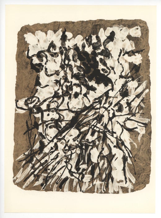 Jean-Paul Riopelle (1923 – 2002) was a painter and sculptor from Quebec, Canada. He became the first Canadian painter (since James Wilson Morrice) to attain widespread international recognition. Born in Montreal, Riopelle began drawing lessons in 1933 and continued through 1938. He studied engineering, architecture and photography at the ecole polytechnique in 1941. In 1942 he enrolled at the Ecole des Beaux-Arts de Montreal but shifted his studies to the less academic Ecole du Meuble, graduating in 1945. He studied under Paul-Emile Borduas in the 1940s and was a member of Les Automatistes movement. Breaking with traditional conventions in 1945 after reading Andre Breton's Le Surrealisme et la Peinture, he began experimenting with non-objective (or non-representational) painting. He was one of the signers of the Refus global manifesto. In 1947 Riopelle moved to Paris and continued his career as an artist, where, after a brief association with the surrealists (he was the only Canadian to exhibit with them) he capitalized on his image as a "wild Canadian". His first solo exhibition took place in 1949 at the Surrealist meeting place, Galerie La Dragonne in Paris. In 1959 he began a relationship with the American painter Joan Mitchell. Living together throughout the 1960s, they kept separate homes and studios near Giverny, where Monet had lived. They influenced one another greatly, as much intellectually as artistically, but their relationship was a stormy one, fueled by alcohol. The relationship ended in 1979. His 1992 painting Hommage a Rosa Luxemburg is Riopelle's tribute to Mitchell, who died that year, and is regarded as a high point of his later work. Riopelle's style in the 1940s changed quickly from Surrealism to Lyrical Abstraction (related to abstract expressionism), in which he used myriad tumultuous cubes and triangles of multicolored elements, facetted with a palette knife, spatula, or trowel, on often large canvases to create powerful atmospheres. The presence of long filaments of paint in his painting from 1948 through the early 1950s has often been seen as resulting from a dripping technique like that of Jackson Pollock. Rather, the creation of such effects came from the act of throwing, with a palette knife or brush, large quantities of paint onto the stretched canvas (positioned vertically). Riopelle's voluminous impasto became just as important as color. Riopelle was arguably one of the most important Canadian artists of the 20th century, establishing his reputation in the burgeoning postwar art scene of Paris, where his entourage included Andre Breton, Sam Francis and Samuel Beckett. Riopelle produced over six thousand works (of which he produced more than two thousand paintings) during the course of his lifetime.