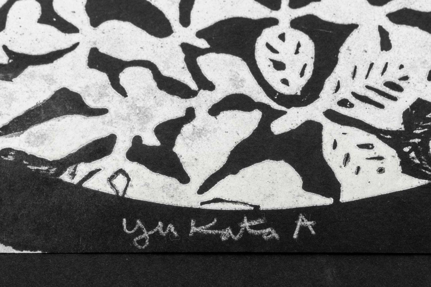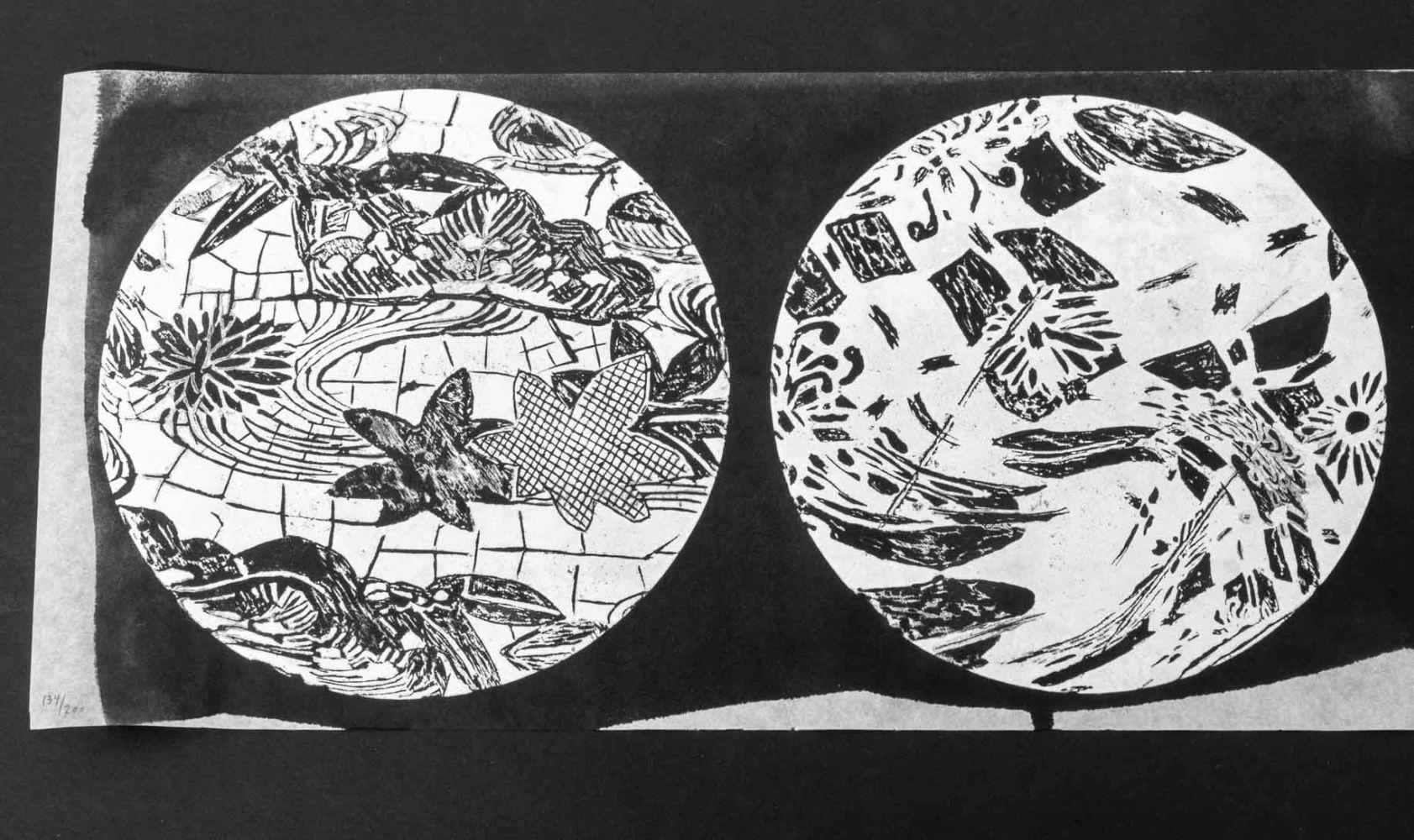 To create the design the artist smoothes out some of the pits with a burnisher so they will hold less ink. Where highlights are required the plate is burnished and polished quite smooth. A wide range of tones are possible in mezzotint and the process can usually be recognized by a light design on a velvety black background. Hamanishi is internationally known for his mastery of this medium. He creates images with both subtle detail and dynamic composition that explore spatial relationships.