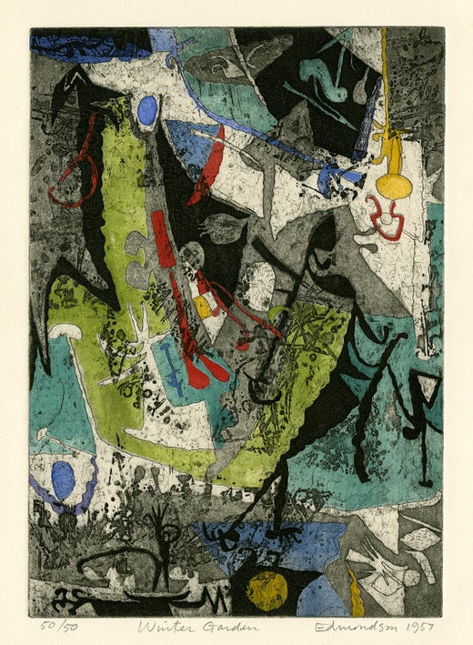 Leonard Edmondson began his career at the University of California at Berkeley, where he earned a Master of Arts degree. After service in the U.S. Army Military Intelligence, during World War II, Edmondson embarked on a distinguished teaching career that spanned five decades and culminated in his position as Chair of the art department at California State University Los Angeles. A renowned printmaker whose work was informed by the experimental printmaking techniques of Stanley William Hayter, Edmondson also worked in a range of other media including oil paint, watercolor and collage. By 1950, Edmondson’s work had evolved from figurative representation into abstraction, in what he cited as a journey of inspiration, discovery and meaning. His distinctive style is inspired by the abstract surrealism of Paul Klee (which he had viewed in Europe during World War II) and the intuitive expressionism espoused by Hans Hofmann. Edmondson's vernacular invokes in his own words ‘almost remembered' forms, feelings and spaces, “This vocabulary manifests itself in a dynamic structure where color responds to the size and position of shapes and reinforces the intent of the composition. My painting is not art of rebellion but one of discovery and sharing.”