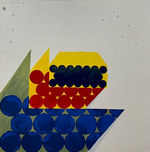 Charles Richard "Dick" Smith was an English printmaker and painter. He Attended St Albans School of Art followed by post-graduate studies at the Royal College of Art, London, from 1954-57. Smith shared a flat-cum-studio with Peter Blake in his second year at the RCA, and then again for two years after he left the college in 1957. When Terence Conran's Soup Kitchen opened on Fleet Street in the late 1950s, it featured a letter-collage mural by Smith and Blake. Michael Chow would later commission Smith to design installations for his restaurant in Los Angeles, and Chow and Conran have remained two of his biggest supporters. In 1959 he moved to New York to teach on a Harkness Fellowship, staying for two years, where he produced paintings combining the formal qualities of many of the American abstract painters which made references to American commercial culture. The artist's first solo exhibition was at the Green Gallery. As his work matured it tended to be more minimal, often painted using one colour with a second only as an accent. In trying to find ways of transposing ideas, Smith began to question the two-dimensional properties of art itself and to find ways by which a painting could express the shape of reality as he saw it. These principles he carried into his graphic work by introducing cut, folded and stapled elements into his prints; some works were multi-leaved screenprinting, and others printed onto three-dimensional fabricated metal. Smith returned to England in 1963 - specifically East Tytherton, Wiltshire where Howard Hodgkin was a neighbour - and gained critical acclaim for extending the boundaries of painting into three dimensions, creating sculptural shaped canvases with monumental presence, which literally protruded into the space of the gallery. Evocative titles such as Panatella and Revlon, and cosmetic, synthetic colours alluded to the consumer landscapes of urban America which had proved so influential. He showed at the Kasmin Gallery, a venture between Kas and the Marquess of Dufferin and Ava in New Bond Street, throughout the 60s, more-widely known as David Hockney's first gallery. Smith was invited to exhibit at the XXXV Venice Biennale as the official British artist in 1970. Smith taught with Richard Hamilton at Gateshead in 1965, where he met Mark Lancaster and Stephen Buckley, and again in 2000, becoming close to the artist and his wife, Terry. By the late 1960s Smith's ambition to produce paintings which shared a common sensibility with other media, such as film and photography, began to wane and he focused on the formal qualities of painting. First exhibited in New York in 1971, the traditional wooden supports of the canvases were replaced by aluminium rods and strings, allowing them to be hung freely in response to the surrounding architecture. Smith continued in the subsequent decades to construct site-specific works in public and private spaces often hanging from the ceilings or architectural supports. He resettled in Patchogue, New York in around 1977. Smith was awarded the CBE in 1971.