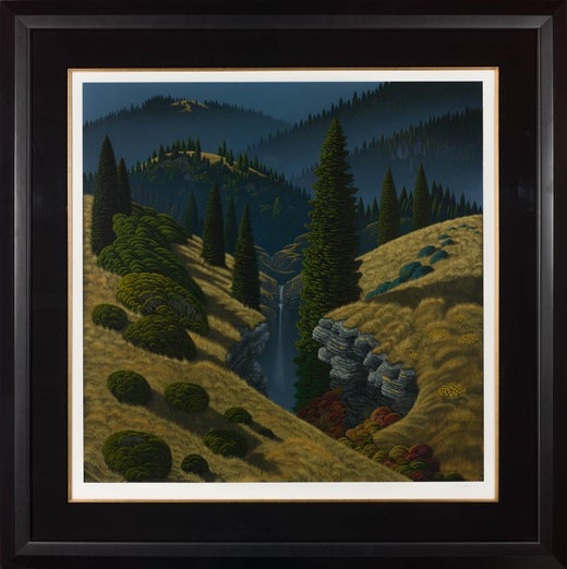Mountain Meadows is a serigraph on paper with an image size 35 x 29 inches, signed 'Ricker' lower right and annotated lower left. From the edition of 500, numbered 155/200 (there were also 50 Roman on paper, 200 Arabic on canvas and 50 AP on canvas). Framed in a contemporary silver-tone moulding.