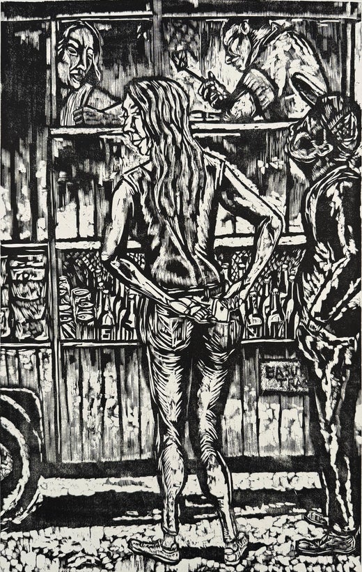 Signed and numbered woodcut from the edition of 15. Political and social satire is a frequent topic in Hazelwood's work. But equally, he enjoys depicting the social scene in specific...