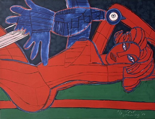 Corneille was one of the founders and one of the most important representatives of the Cobra movement. He was a very productive artist and made an enormous amount of paintings, sculptures and graphics. Initially strongly influenced by Picasso, but later with the very familiar style characteristics of the Cobra. Corneille worked abstractly, but from 1960 on he worked figuratively with the famous birds, women, and flowers as a subject.