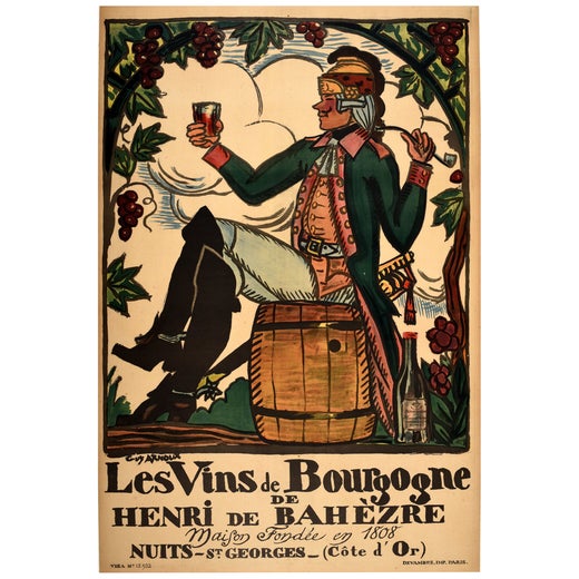 Original antique French wine advertising poster for Henri de Bahezre's Burgundy Wines / Les Vins de Bourgogne de Henri de Bahezre featuring great artwork by Guy Arnoux (1886-1951) de...