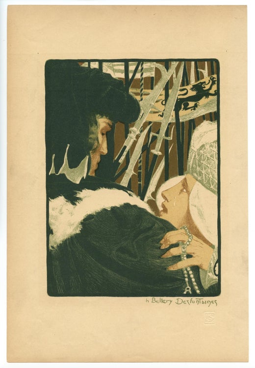Henri Bellery-Desfontaines started as a painter in the atelier of Pierre-Victor Galland, who entrusted him with the decorative motifs that would frame Panthéon de Paris' drawings of Maillot, Bonnat, Humbert and specially Jean-Paul Laurens, who had also later proposed to him to join his atelier in l’École des Beaux-Arts de Paris. With Laurens, Henri Bellery-Desfontaines decorated l'Hôtel de Ville de Paris also known as Le Salon Lobau. Henri Bellery-Desfontaines is thought to have Luc-Olivier Merson as a teacher. During his years as a student, he started to illustrate magazines and books of tales and in 1895, Bellery-Desfontaines opted rapidly for illustration, probably due to financial problems, and he participated in magazines such as L’Image, L’Estampe Moderne or L’Almanach des Bibliophiles. From 1900 on, he gradually evolved toward an ambitious decorative artist, making tapestries and furniture for rich leaders and patrons. Bellery-Desfontaines was an important artist of his epoch, and he took part in numerous events like Bal des Quat'z'Arts or Bal de l'Internat. He also made lots of illustrations such as a joker for the playing cards company Fossorier Amar et Cie, a typography for Fonderie G. Peignot et Fils, or the portraits of Yvette Guilbert, Mounet-Sully, etc. He left a vast artistic production adorned with floral and vegetal motifs and so many unfinished works since he died young from typhoid fever at the age of 42. Recently, the Salon des Artistes Français hosted one of his designs of tapestry.