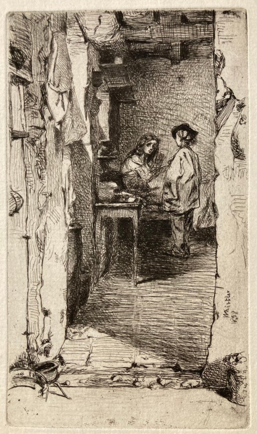 James Abbott McNeill Whistler was an American artist active during the American Gilded Age and based primarily in the United Kingdom. Whistler was born on July 11, 1834, in Lowell. During his formative years in Paris in the 1850s, Whistler was influenced by the injunctions of the poet and theorist Charles Baudelaire that artists should take subjects from modern life and seek a new beauty in the teeming cities. Whistler's first major suite of prints, his French Set brought critical acclaim but disappointing sales. Seeking more generous patrons, he moved to London in 1859. Initially, under the influence of his brother-in-law Francis Seymour Haden, a pioneer of the etching revival, he began a series of superbly observed and finely detailed views of the River Thames with its shipping, thriving wharves and picturesque characters. In his Thames Set etchings, Whistler often introduced the figures of workmen, boatmen or loungers in the foregrounds. Whistler died on July 17, 1903, in London.