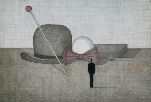 Surrealistic figurative print by Polish artist Joanna Wiszniewska-Domanska. Artwork depictics a man dressed in black visible from the back. There are magician's accesories in front o...