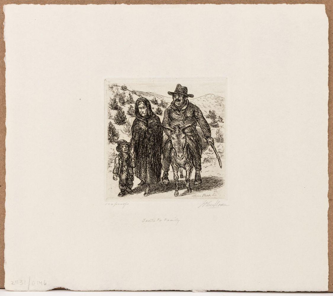 John Sloan (American, 1871-1951), "Sante Fe Family", Etching on Wove Paper, 1937, numbered edition 75/100, signed in pencil and in plate lower right, titled lower center, and marked "100 Proofs" lower left, additional marking "2531/0146 lower left corner, unframed. Image: 3.25" H x 3.25" W; sheet: 7.5 H x 8.5" W. Provenance: From a New York City Collection.