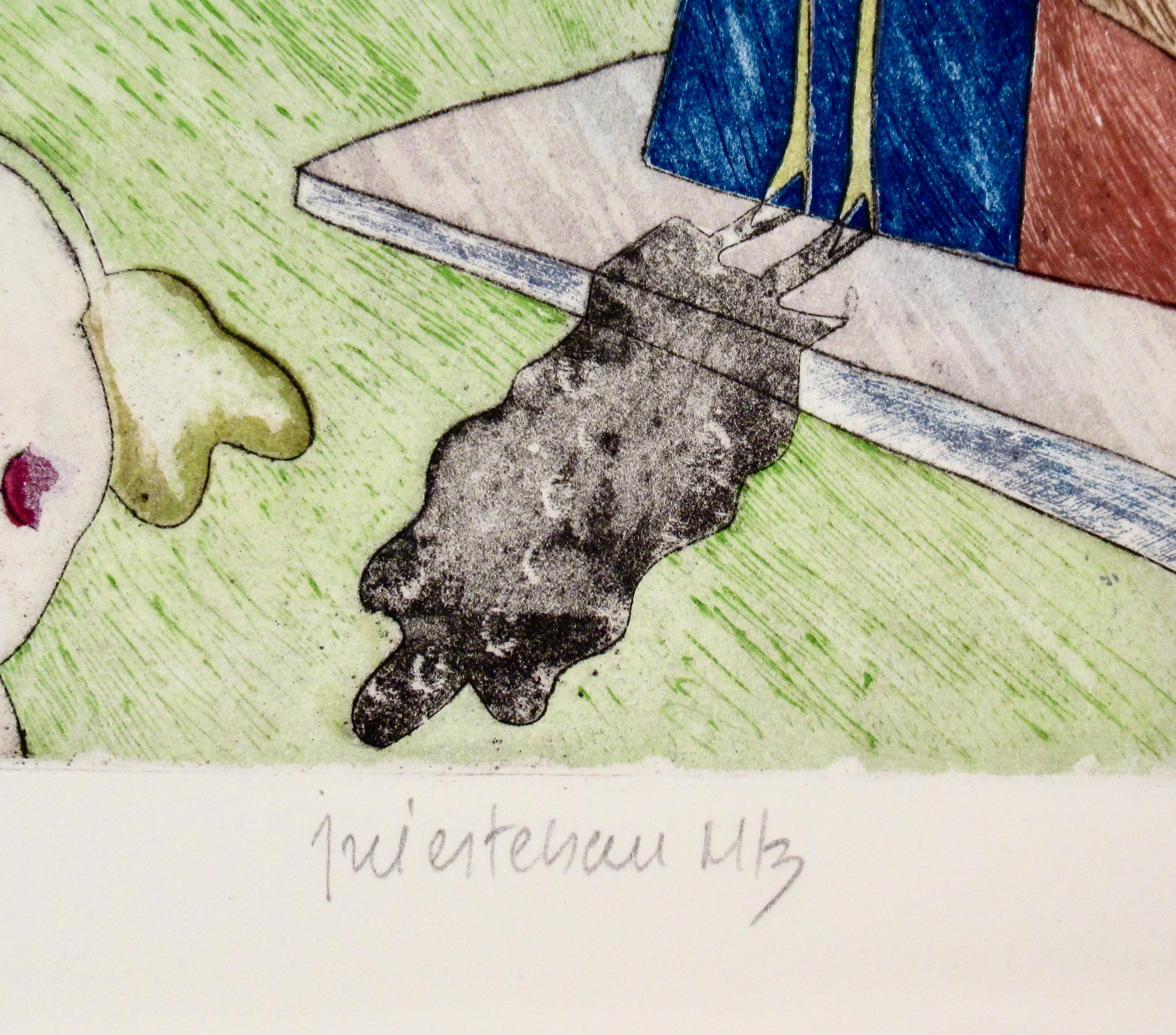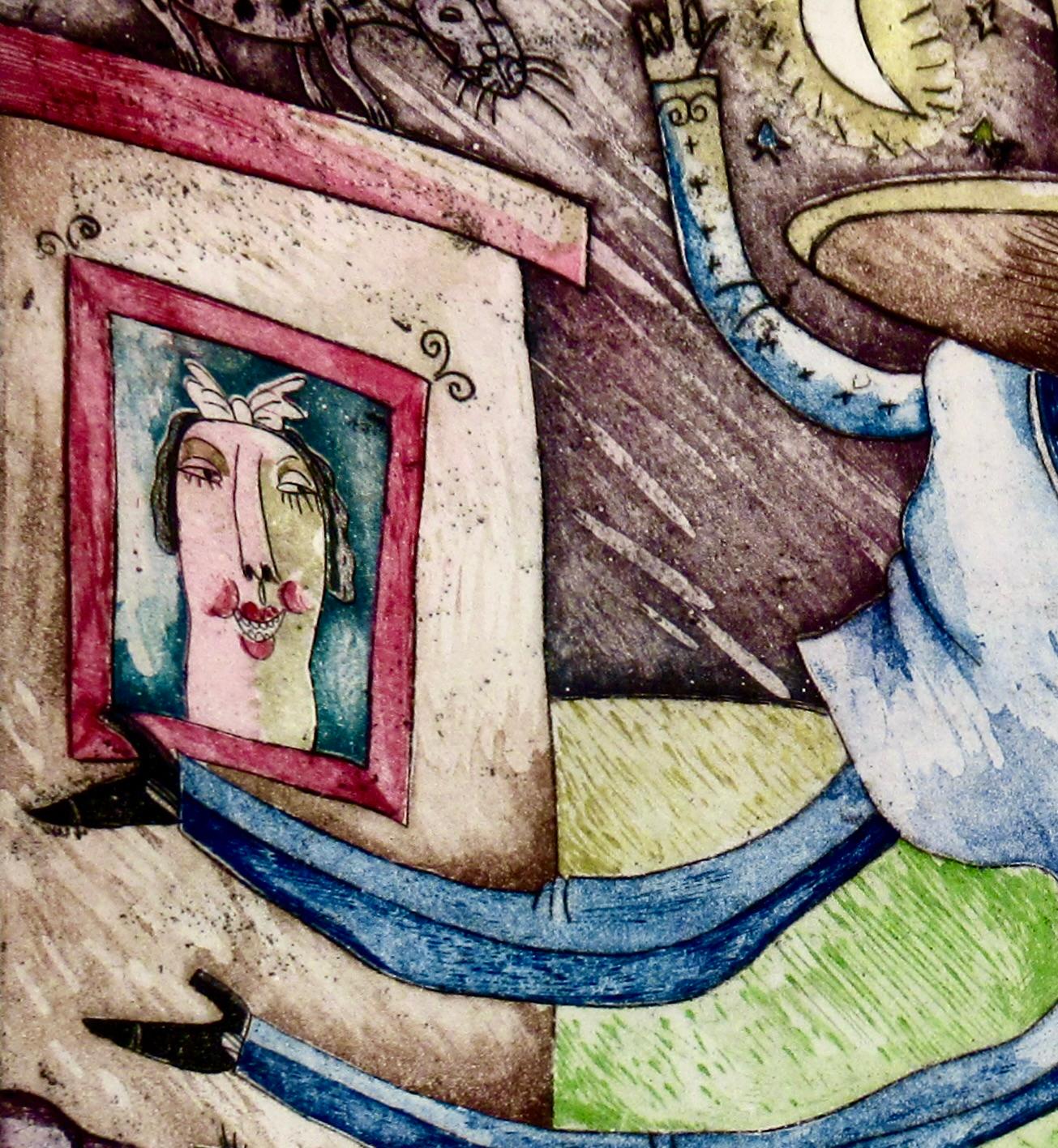 This artwork "Flying Man" c.1990, is an original colors etching with aquatint on Wove paper by noted Mexican artist Jose Esteban Martinez, b.1951. It is hand signed in pencil by the artist. The plate mark (image) size is 11.85 x 13.85 inches, sheet size is 15.5 x 18 inches. It is in excellent condition, has never been framed.