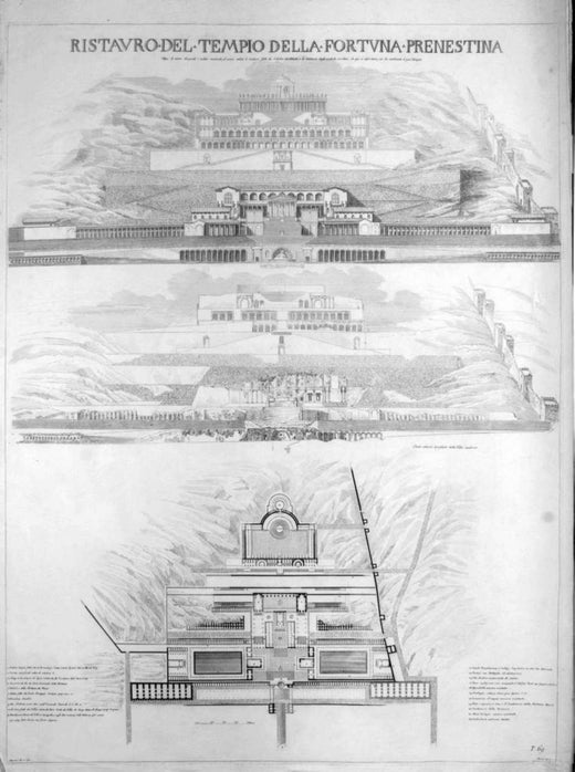 Like Giovanni Battista Piranesi, Luigi Rossini was an architect and his etchings have the same tendency to emphasize the massive constructions of the Ancient Rome. He became famous thanks to his etchings representing Roman landscapes and antique monuments. Among which “Le antichità de' contorni di Roma ossia le più famose città del Lazio. Tivoli, Albano, Castel Gandolfo, Palestrina, Tuscolo, Cora e Ferentino”, a collection of 72 plates published in Rome, 1826.