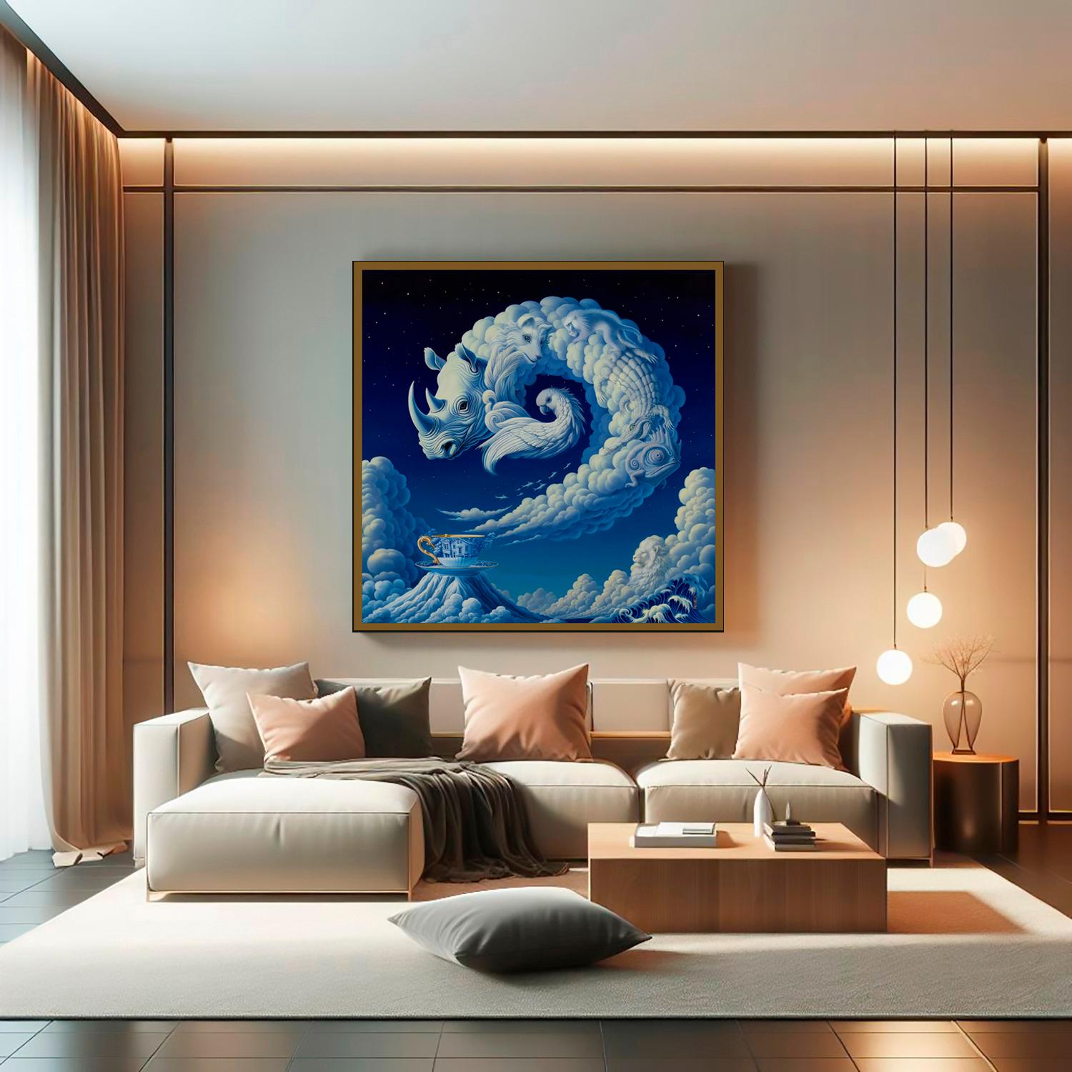 “Cloud“ is a luminous meditation on memory, nature, and myth. A celestial spiral of cloud forms drift weightlessly through an eternal sky, blurring the boundary between dream and reality. Each animal emerges organically from the swirling vapor, like archetypes born from the breath of the cosmos. This surreal composition invites viewers into a metaphysical journey—one where clouds whisper old stories, and winds turn pages of forgotten fables.