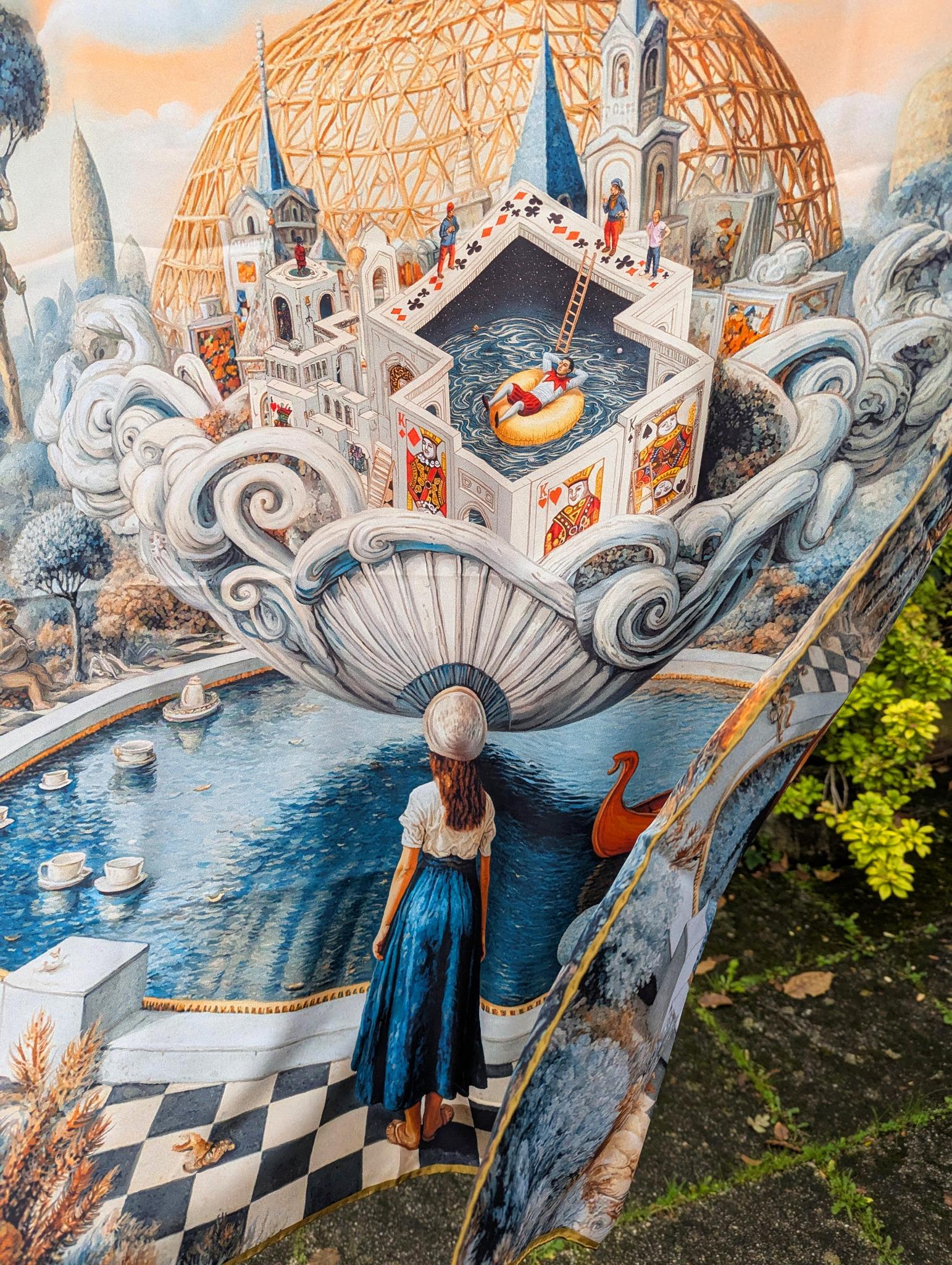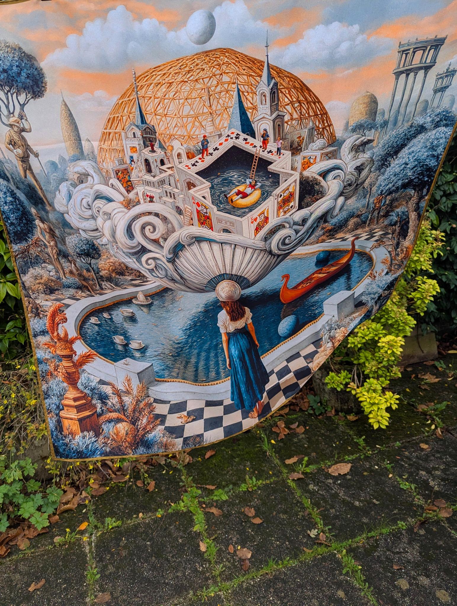 Balcony is a surrealist silk artwork where architecture, dream logic, and human emotion merge into a single theatrical tableau. A monumental spiral structure—part shell, part celesti...