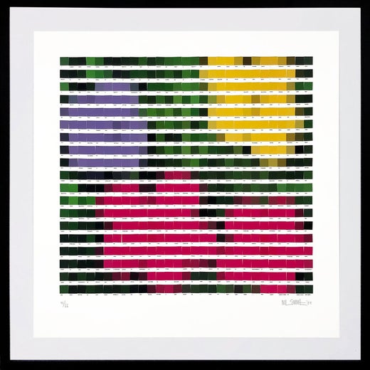 The artwork is based on his Pioneers series, presented at Rhodes Contemporary Gallery in 2020, where the artist reinterpreted iconic images using his signature pixelated collage approach with color swatches. Within this context, Fame was created from the original collage Yellow Flowers, 2020, one of the standout pieces from the exhibition. In this series, Smith paid tribute to influential artists who have redefined contemporary art, such as Andy Warhol. Specifically, Fame pays homage to Warhol’s iconic Flowers, reinterpreting them through Smith’s characteristic style of image fragmentation and the inclusion of words associated with each hue.