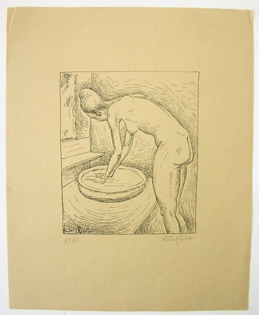 Here Kitaj depicts a sculpture of a nude woman, shaded delicately in black, printed on wonderfully textured handmade muted orange paper. The woman’s hand reaches to the inside of her...