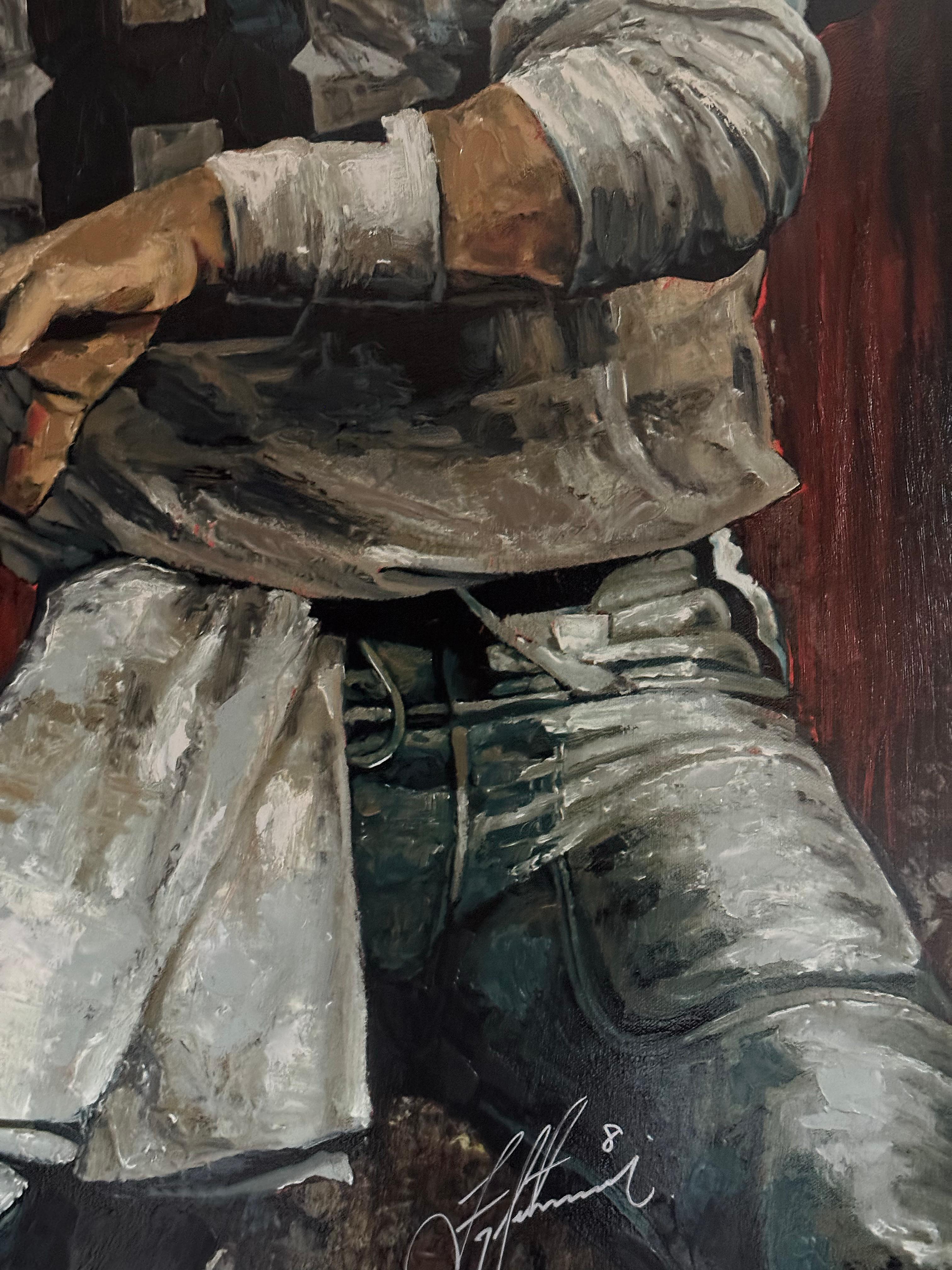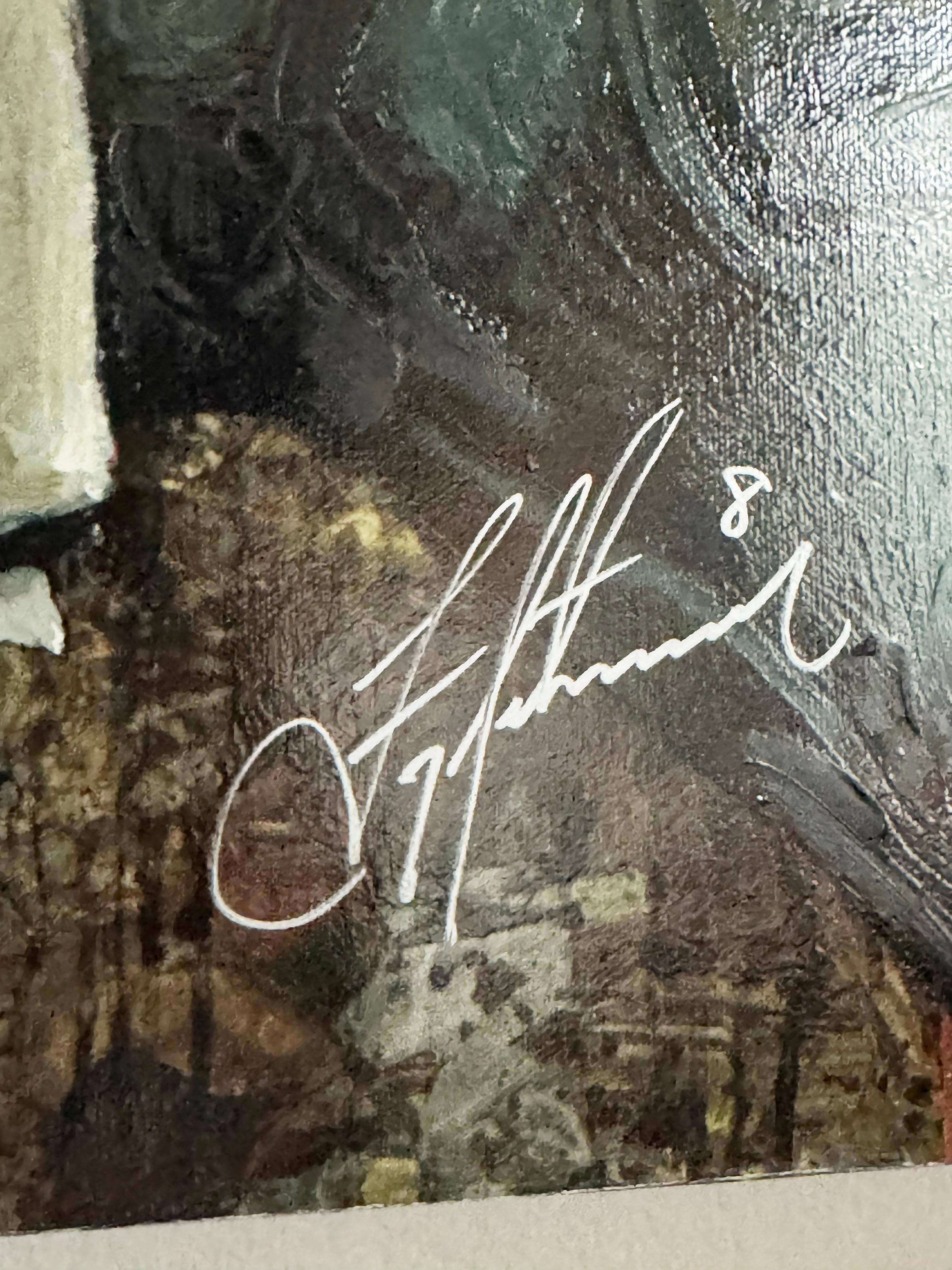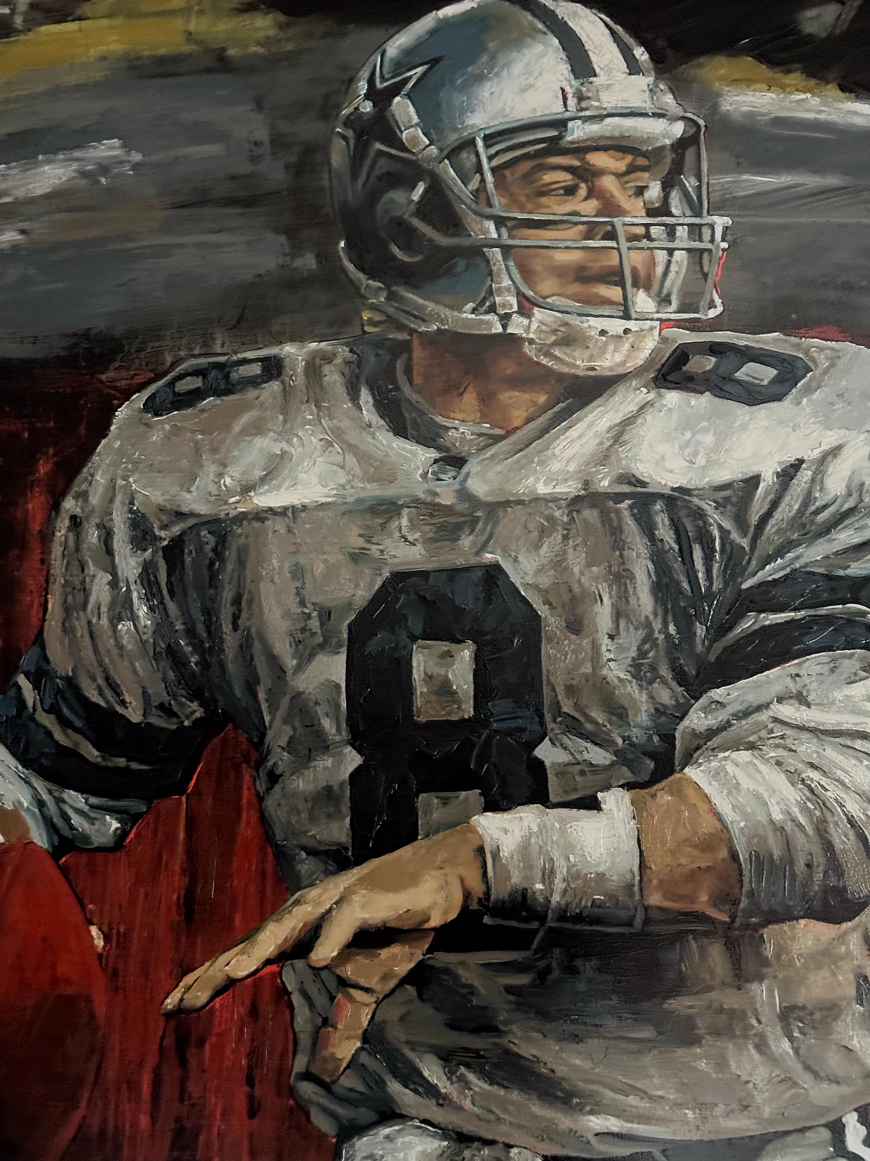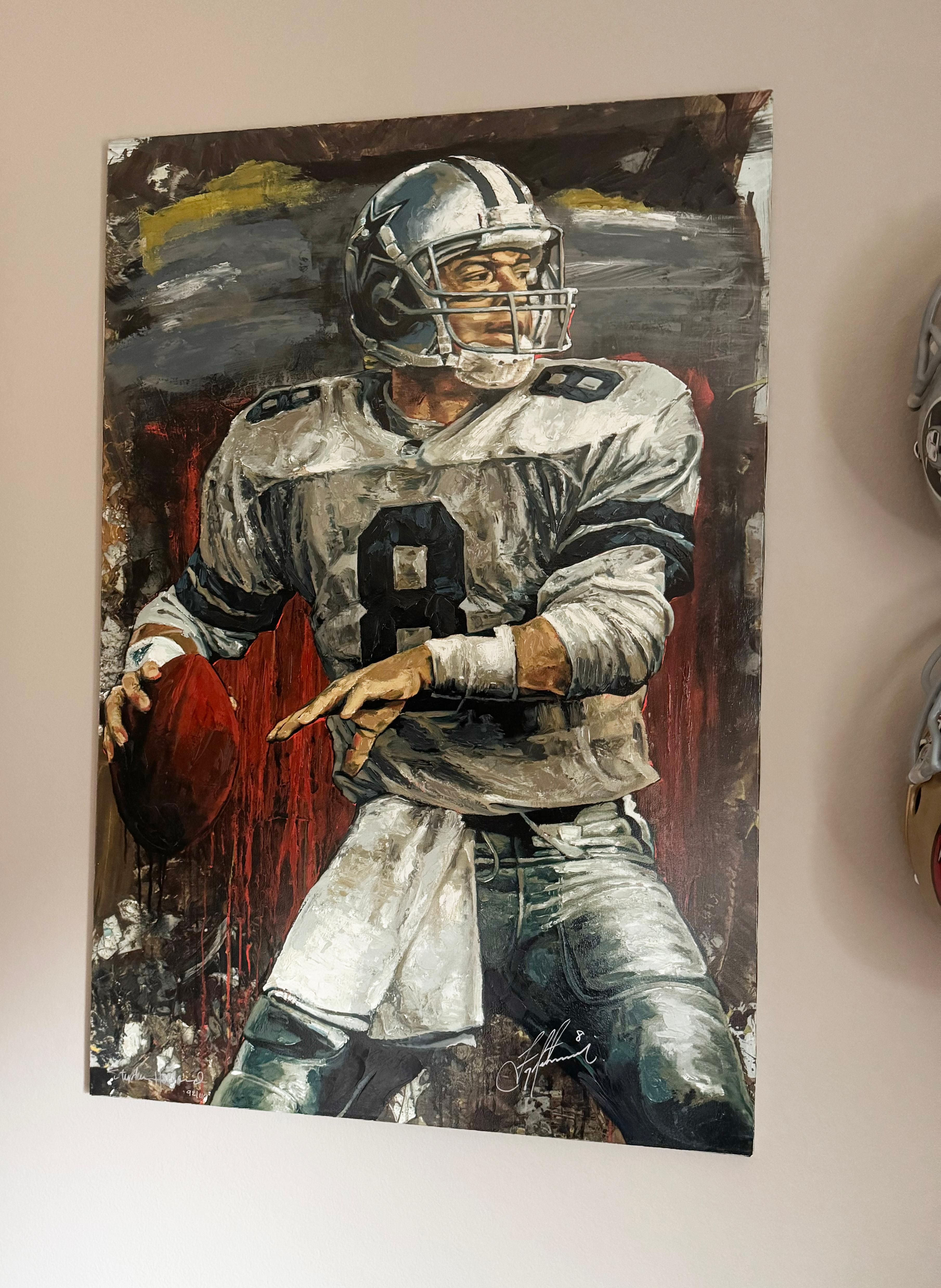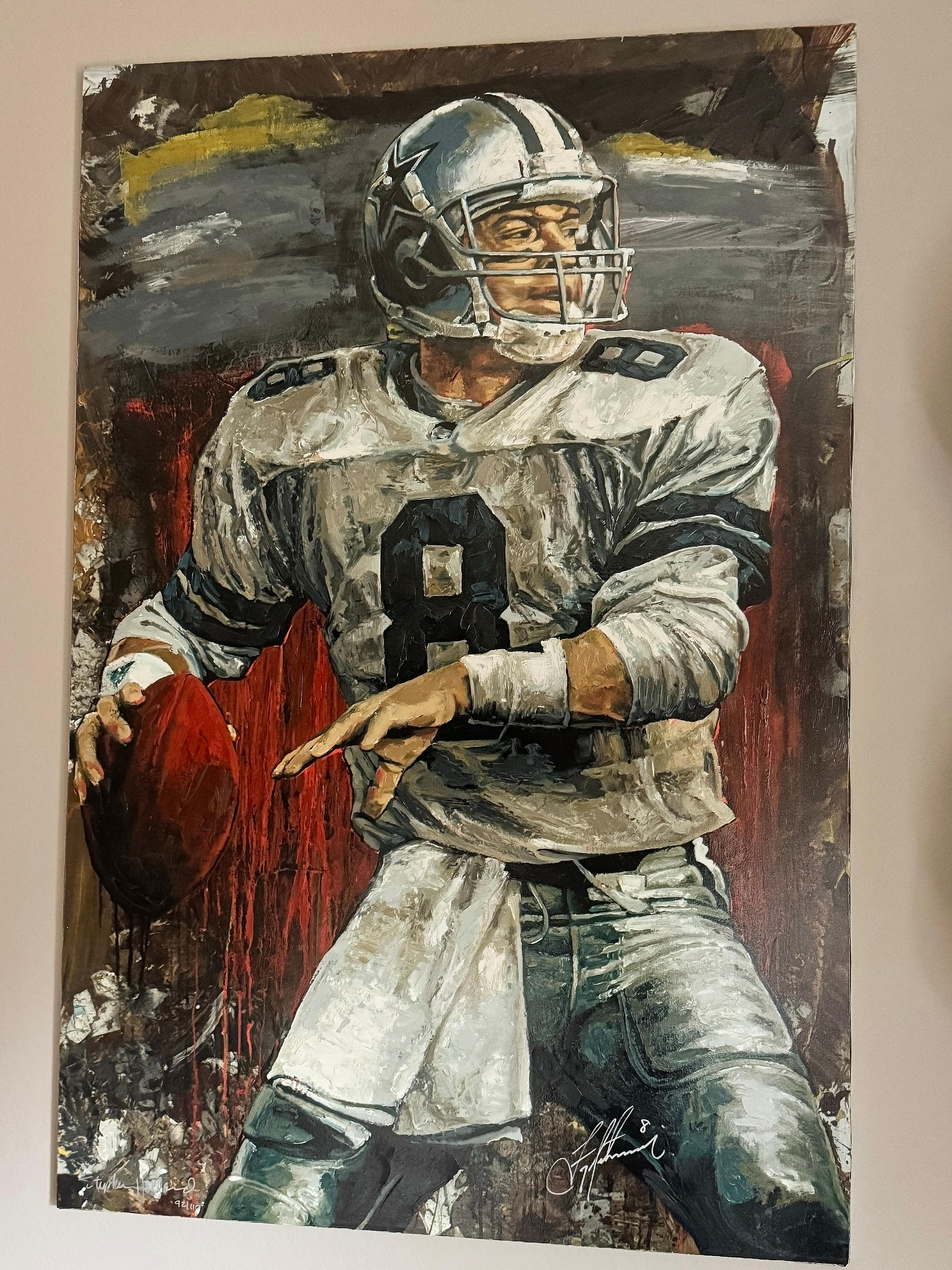 This commanding hand embellished giclée captures NFL legend Troy Aikman in mid-action—his pose frozen with focus, strength, and confident resolve. The 92/110 edition number underscores its place in a limited, numbered series, while the artist's own application of brush texture and layered strokes elevates the print into a hybrid of fine art and sports tribute. Holland’s signature gestures—energetic marks, contrast, and dramatic lighting—give Aikman a presence that feels alive on the canvas. Signed by both Stephen Holland and Troy Aikman, this piece bridges the worlds of sports memorabilia and collectible fine art. The synergy of iconic athletic imagery and painterly technique makes it a standout in any collection of sports art.