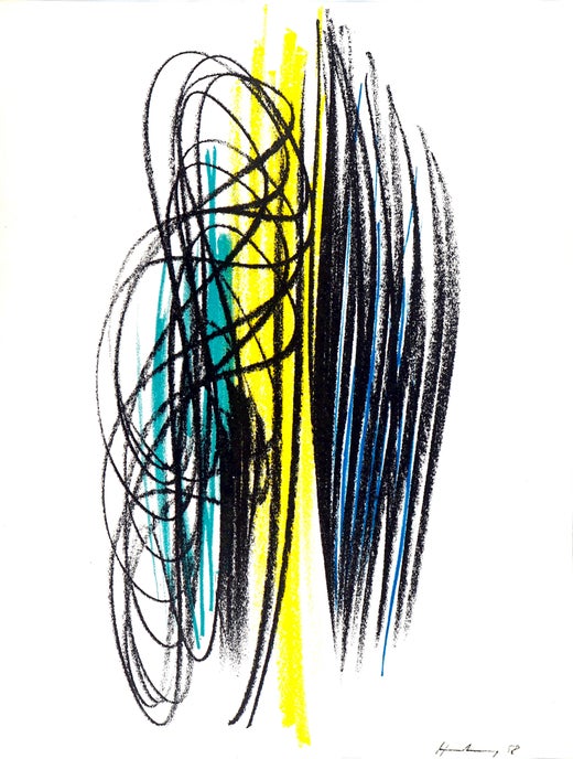 Hans Hartung is commonly presented as a standard-bearer for the École de Paris and the lyrical abstraction and is primarily considered as a post-war painter. Nevertheless, in the late 30s, this German-born artist had already participated in numerous exhibitions throughout Europe. His career began in 1922 at the age of just 18 years, when he didn’t even know the theories of Kandinsky but produced a series of abstract watercolors striking by their sheer expressiveness. This was the beginning of a career that lasted nearly 70 years and was punctuated by constant technical innovations. Paradoxical artist, Hartung was often at the opposite of the image the critics build of him, resulting in a distorted reception (Annie Claustres). Presented as a champion of gestural, lyrical and emotional painting, he remained passionate for mathematics, and his painting was apprehended through its rationality: from the 30s to the late 50s, he first produced small-sized works, spontaneously executed on paper; then he created the painting by laying down a grid and scaling up the small-size paper onto a canvas, referring point by point. The 60s also marked a turning point. Hartung stopped working by reproducing small formats but entered a patient search for technological innovation, including the production of multiple tools. In 1960, he won the grand prize for painting at the Venice Biennale, reaching the top of international recognition. Hartung never stopped creating, paintings with still more ardor until his last days in his property of Antibes that he had designed himself.