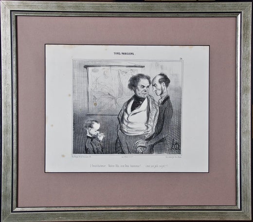 This is a rare 19th century satirical lithograph by Honoré-Victorin Daumier entitled "Types Parisiens, L'InstItuteur: Votre fils me fera honneur!....c'est un joli sujet!!!", No. 24 (Parisian Types, The Institutor: Your son will be my honor! ... it's a nice subject !!), published in Paris in the satirical magazine La Caricature, May 24, 1840 by Aubert et Cie. It depicts a man presenting his son to another man, presumably a teacher or school headmaster, who politely states that it would be an honor to take care of such a nice boy, as he watches the boy picking his nose. An apparent teaching poster or map hangs on the wall in the background.