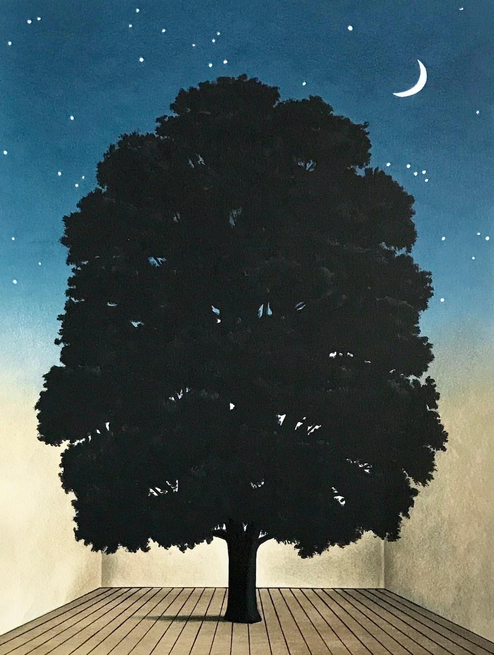 SONG OF PRAISE is a surrealist composition portraying a curious interior scene featuring a full, dark blue black leafy tree positioned on a yellow beige wood planked floor within a room backlit by a dark night blue sky with white crescent moon visible in the background. A fascinating and mysterious image to contemplate....