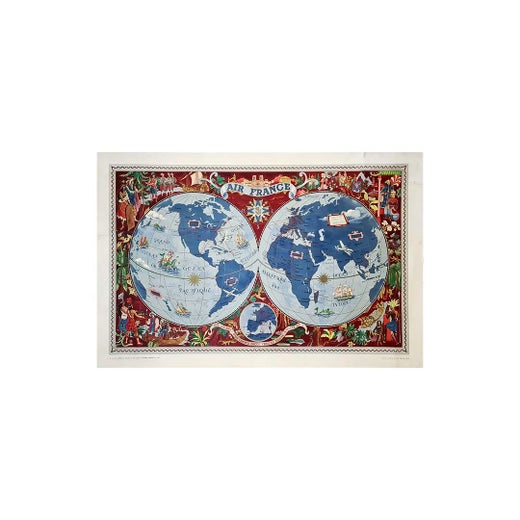 Original Vintage Travel Route Poster Air France Planisphere Map Lucien Boucher