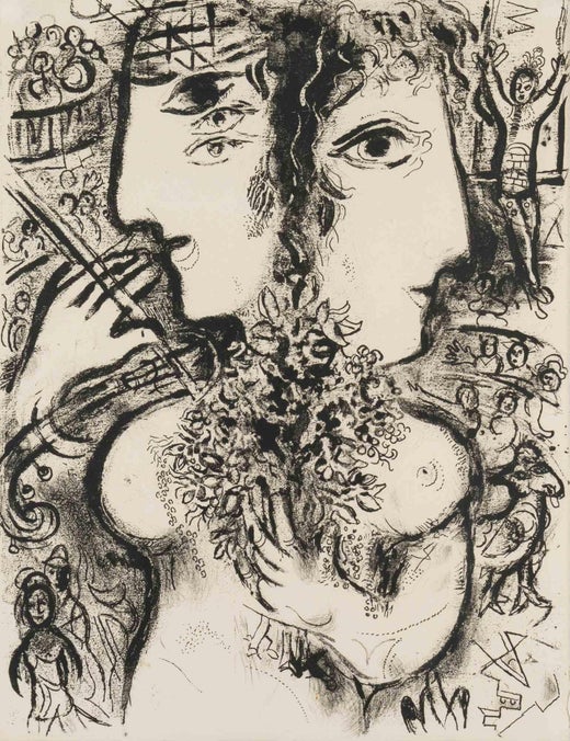 Born Moishe Segal in 1887, in Belarus (then part of the Russian empire), Chagall is often celebrated for his figurative paintings, but he also produced stained-glass windows for the cathedrals of Reims and Metz, in France; for the United Nations, in New York; and for the Hadassah Hospital in Jerusalem, as well as book illustrations, stage sets, ceramics, tapestries and fine-art prints. Characterized by a bold color palette and whimsical imagery, his works are often narrative, depicting small-village scenes and quotidian moments of peasant life, as in his late painting The Flight into Egypt from 1980.