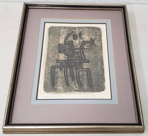Etching with carborundum, aquatint, and collage that is signed and numbered.