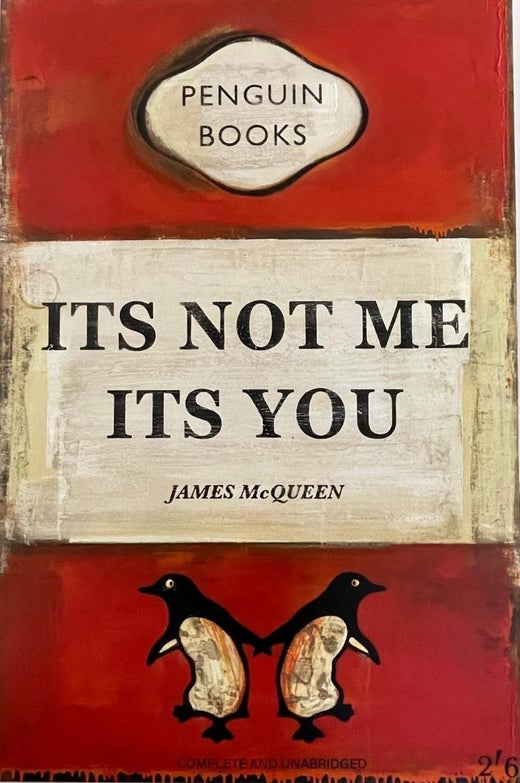 James McQueen, born in 1977, is a British contemporary artist recognized for his evocative paintings that reimagine vintage book covers, particularly those of Penguin Books. Operating under a pseudonym, McQueen chooses to remain anonymous, allowing his art to speak independently. His works are characterized by a deliberate portrayal of wear and tear, achieved through layering and sanding techniques that mimic the aged appearance of well-loved books. The incorporation of bold, often satirical titles and the recurring motif of a spray-painted monkey wearing a hat—his personal insignia—adds depth and a playful edge to his pieces. McQueen's art draws inspiration from Pop Art and Abstract Expressionism, echoing influences from artists like Andy Warhol and Mark Rothko.