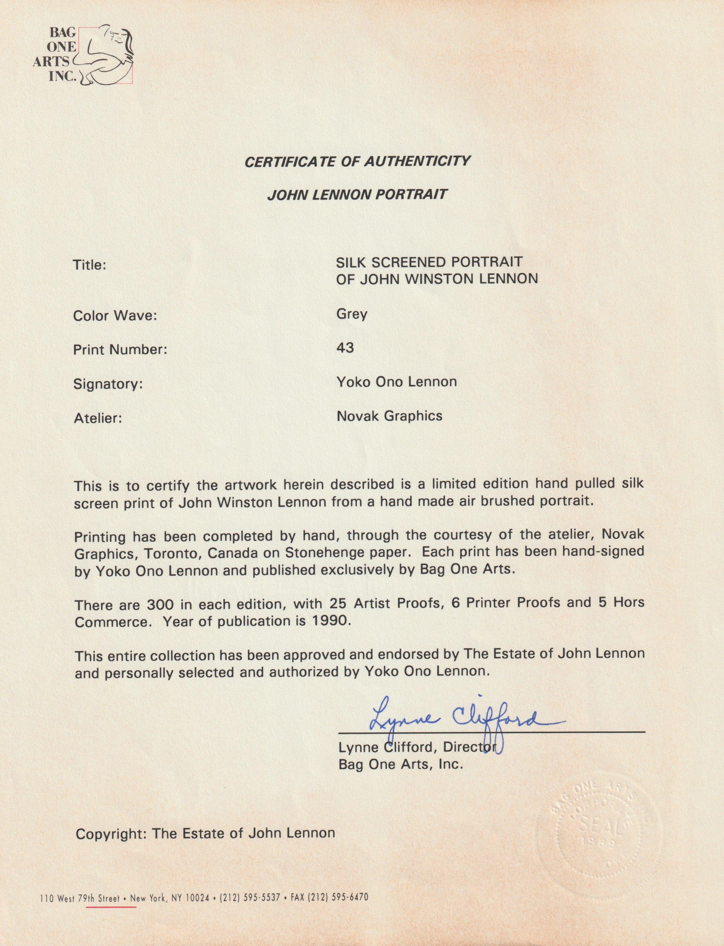 Limited Edition Serigraph of John Lennon's portrait. The original photograph was taken by the Lennon's personal photographer in Japan in 1977. The silkscreens were added by Yoko O...